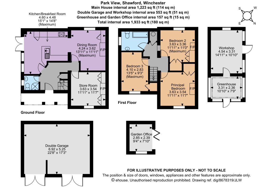 There is an excellent and generous outbuilding, currently utilised as a workshop and storage, along with an adjoining greenhouse. In addition, there is a studio/office space which has heating and power. There is also a double garage ideally suited for a car or general storage requirements which is a short walk from the house