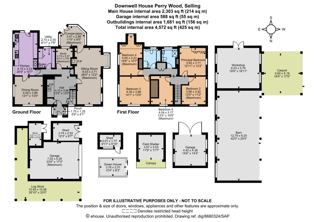Five-bar wooden gates open to the driveway, which provides plenty of parking space in front of the house, as well as access to the various outbuildings located to the north of the house. These include two detached garages and a large open-sided barn with an attached workshop and a double carport.