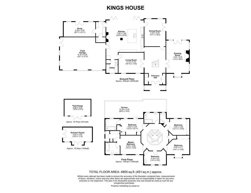 Poles Park is entered through automatic security gates and well-maintained communal grounds, two sets of further electric double gates opening to the property’s in-and-out block-paved driveway which provides private parking and gives access to the integral triple garage. Backing onto the golf course, the generous manicured garden to the rear is laid mainly to level lawn bordered by mature hedging and features a swimming pool with paved surround and an adjacent pool house, a further summer house and paved terraces. The whole is idea for entertaining and al fresco dining.