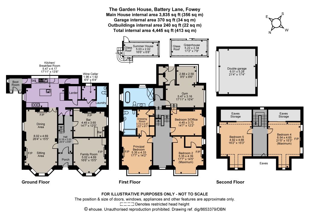 The property is situated on the peaceful Battery Lane, with off-road secure parking for three vehicles in the double garage and adjacent platform. There is an entrance into the first-floor gym at the rear of the house while the main entrance is at the front, facing the harbour. The gardens at the front are west facing and enjoy a magnificent elevated position overlooking the River Fowey estuary, with views out to sea. There are terraced areas at the sides, as well as a greenhouse and a summer house, while beyond, the gardens drop away to reveal terraced lawns, peaceful meadows and wooded areas, as well as a badminton court or croquet lawn. The gardens lead right to the point, where there are stone steps providing access to the beach and water’s edge.