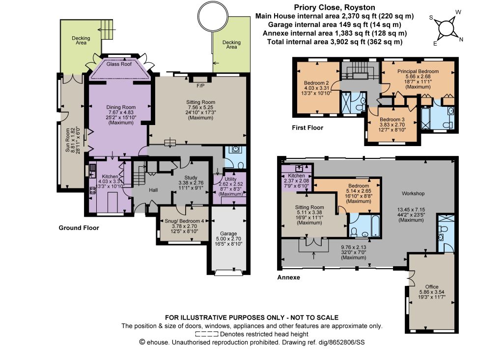 Set behind low-level walling topped with mature hedging and offering plenty of kerb appeal, the property is approached via a tarmac driveway providing private parking for several vehicles and access to the integral garage. The generous, well-maintained enclosed rear garden is laid mainly to level lawn, bordered by well-stocked flower and shrub beds and interspersed with mature trees. It features numerous seating areas, a raised decked balcony, and both paved and decked terrace areas—ideal for entertaining and al fresco dining. A standout feature is the extensive L-shaped timber outbuilding (approximately 1,383 sq ft), which incorporates a spacious dual-aspect office with en suite shower room, a large vaulted workshop with three sets of patio doors to the rear, and an annexe comprising sitting and sun rooms (the latter with three sets of patio doors to a private, hedge-screened paved terrace), a kitchenette, and a double bedroom with en suite bathroom