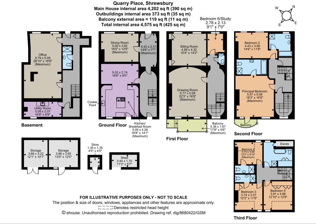 The first floor offers a generous, airy drawing room with a chandelier light fitting, corniced ceiling, castiron fireplace and two tall sash windows welcoming plenty of natural light from its southeast-facing rear aspect. There is also a comfortable sitting room, also with an ornate fireplace and two large sash windows, as well as a bedroom, which could be used as a study if required. Across the second and third floors there are a further five double bedrooms, four of which are en suite. These include the spacious principal bedroom on the second floor, which has built-in wardrobes, a balcony and a large en suite bathroom with a bathtub and a separate shower unit. One further bedroom has an en suite bathroom, with two featuring en suite shower rooms. A family bathroom can also be found on the third floor, with a roll-top bathtub and a separate shower.
