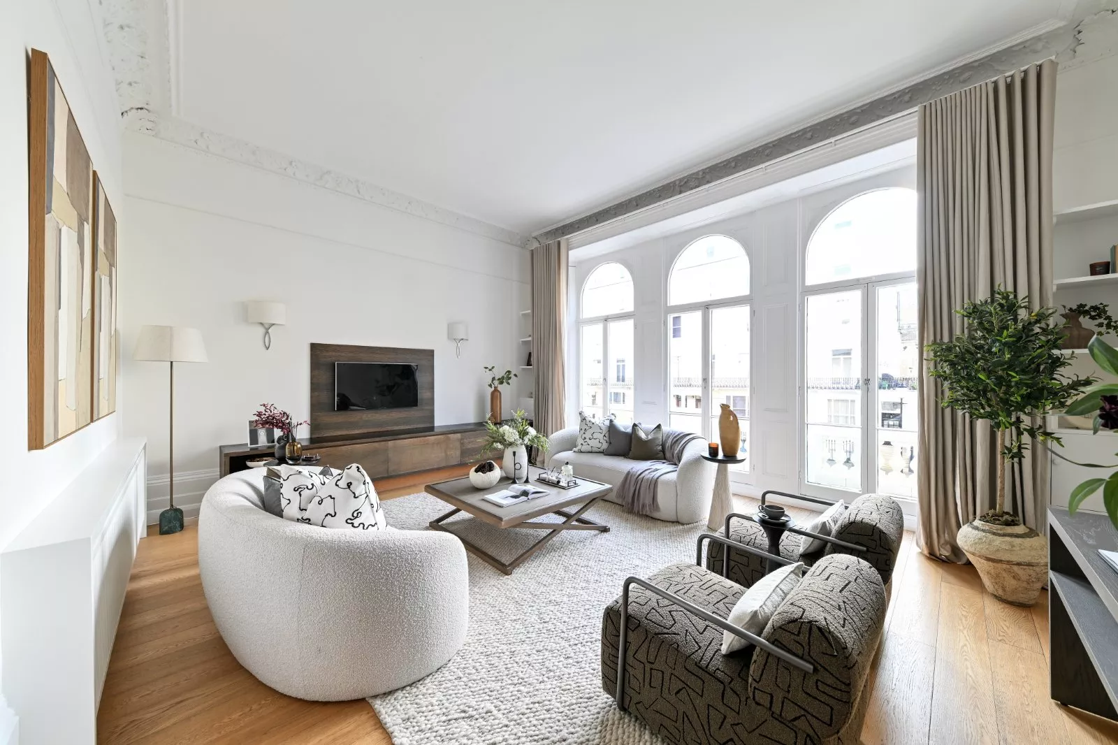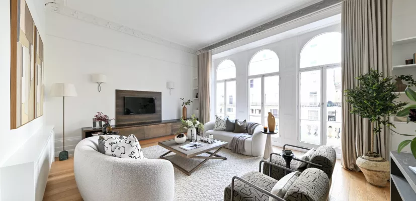 Wooden flooring large windows, soaring ceilings and outside space gives the apartment radiance.