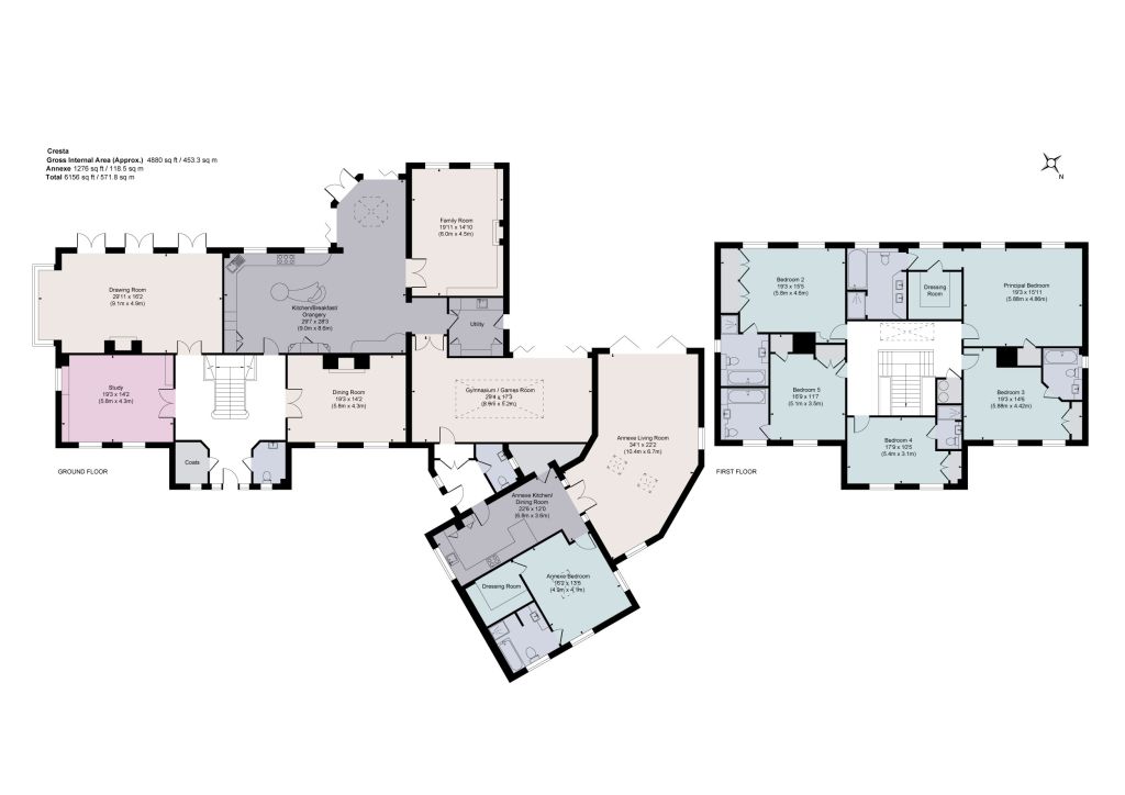 The spacious drawing room features a fireplace and three sets of double doors that open the room out to the garden, and combined with the formal dining room, also with a fireplace, provides superb excellent entertaining and relaxation space. The ground floor further comprises a 29 ft gymnasium/games room with a large roof lantern and bi-folding doors to the outside, a utility room, and two cloakrooms.