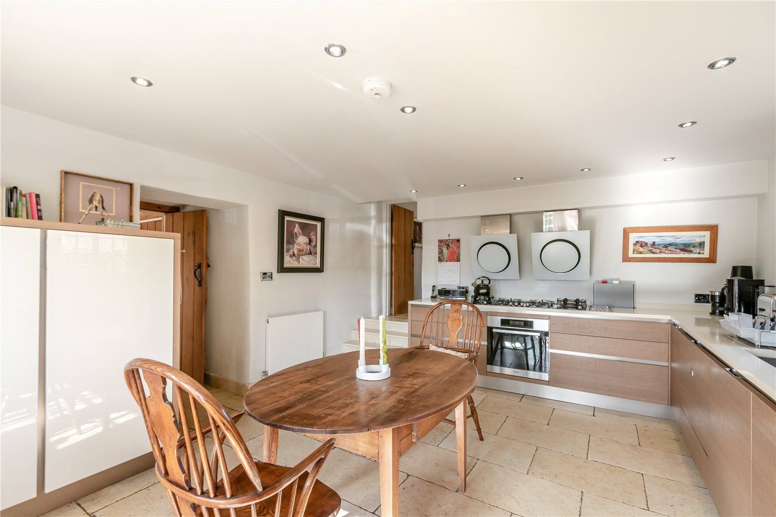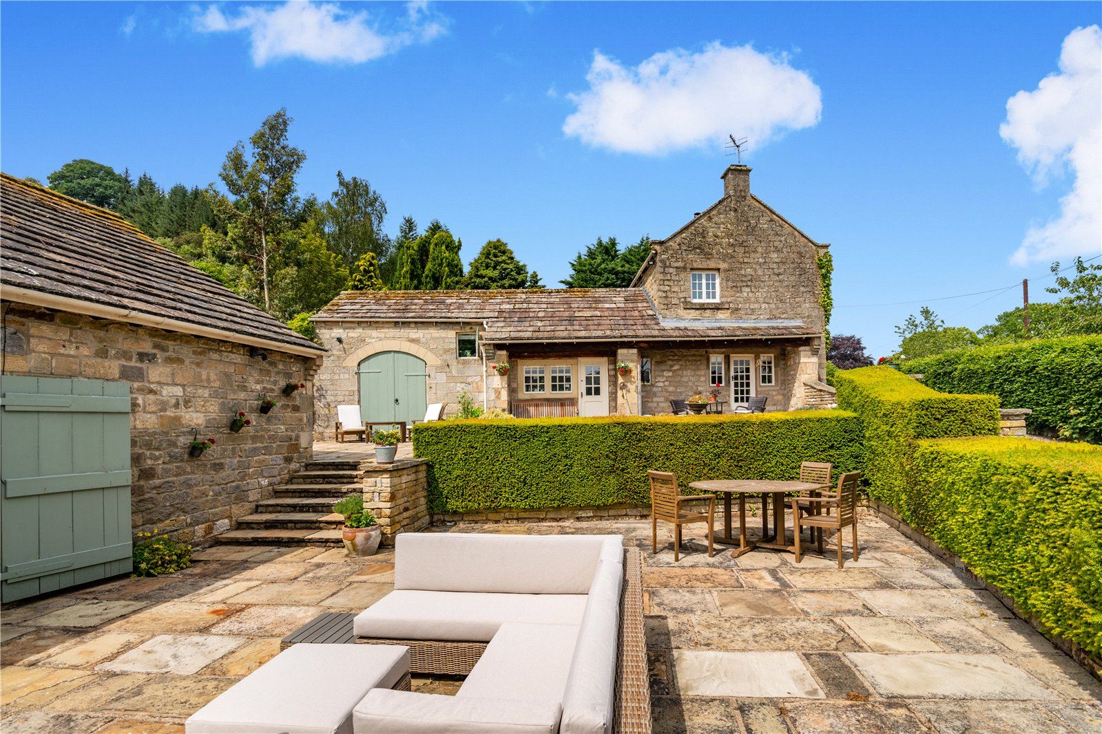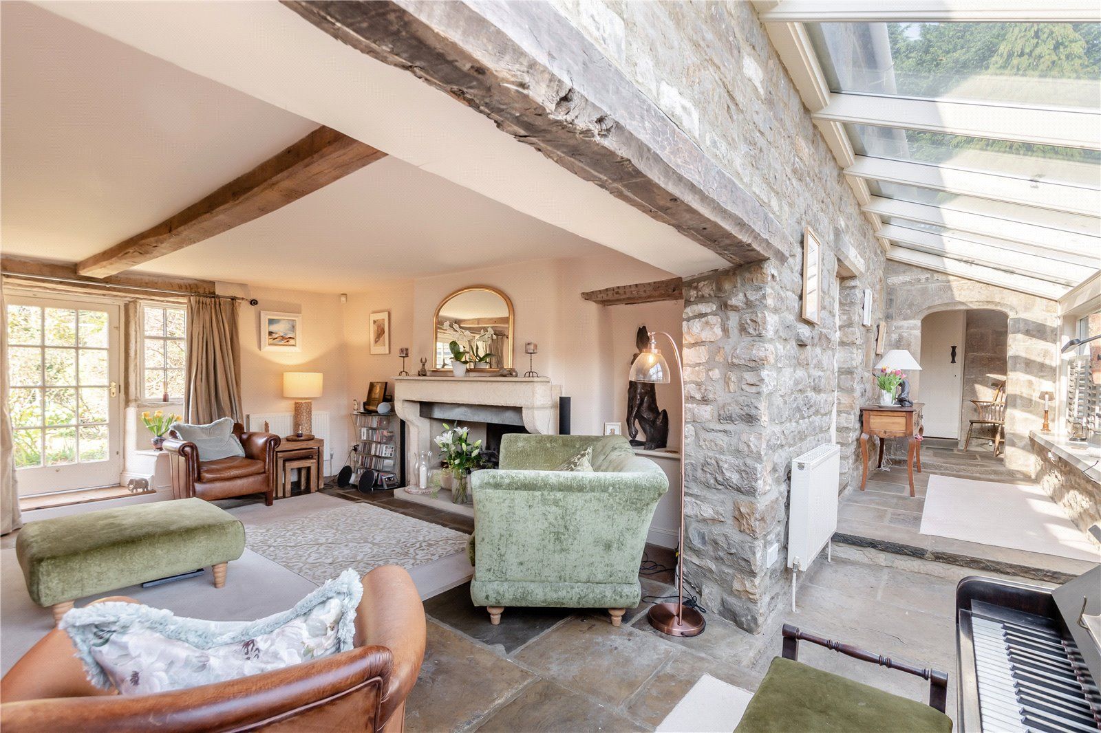 The ground floor is arranged around a welcoming reception hall, leading to a series of well-proportioned reception rooms, including a drawing room with a substantial stone fireplace and hearth. A light-filled conservatory extends along the front elevation, linking seamlessly to a comfortable sitting room with fitted bookshelves, together with a separate utility room. The kitchen/breakfast room is well-appointed with Siemens and Miele appliances, a walk-in cold room and an adjoining boot room with cloakroom. From here, an oak door opens into the formal dining room, with French doors leading out to the gardens. A study with direct garden access and a spacious guest suite, with its own private staircase, complete the ground floor.