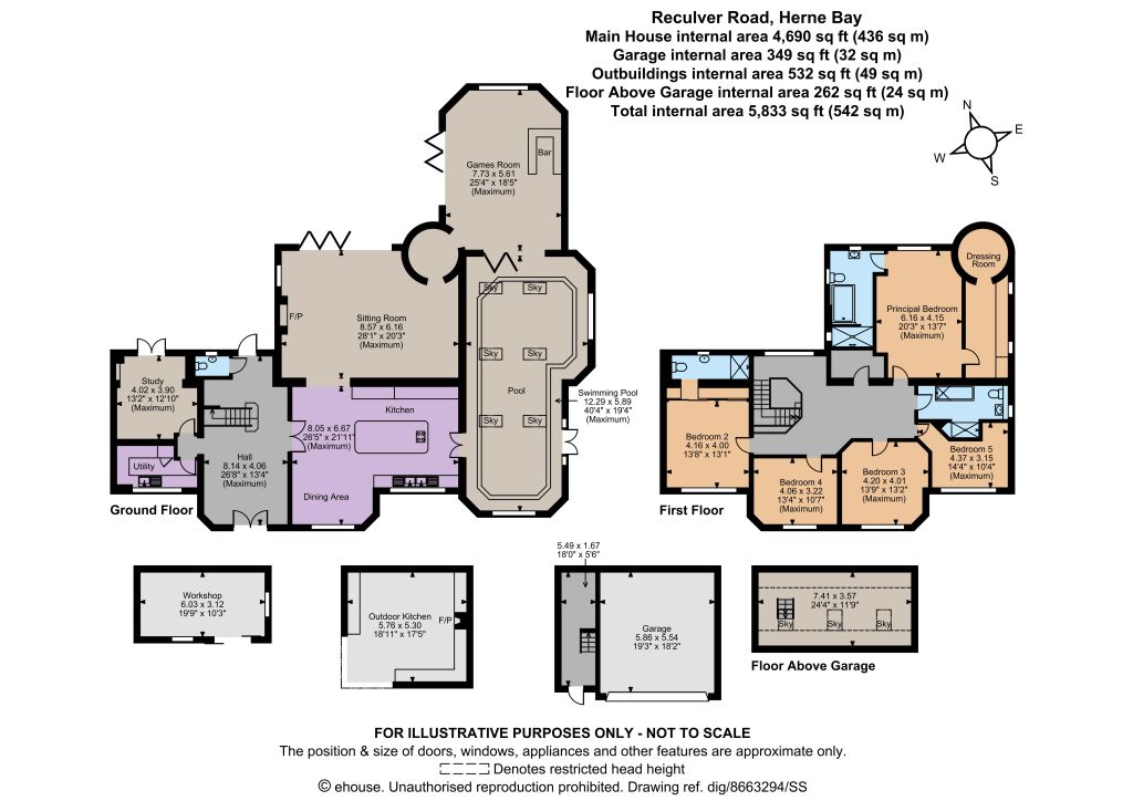 The sitting room also opens to a P-shaped kitchen/dining room, also accessible from the hall. It provides a range of bespoke contemporary high-gloss wall and base units, a central island with breakfast bar, twin sinks, complementary worktops, modern integrated appliances, space for a sizeable dining table and French doors to the pool room.