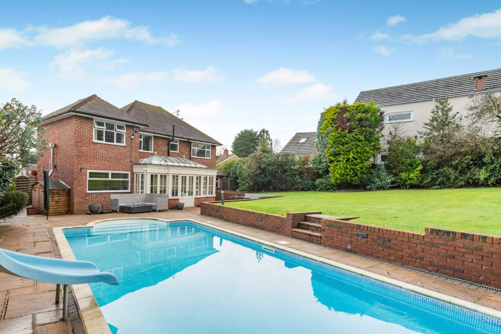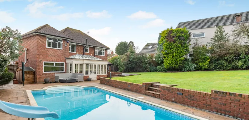 At the front of the house, a block-paved driveway provides plenty of parking for several vehicles, as well as access to the integrated garage for further parking or home storage and workshop space. The garden at the rear has a patio area for al fresco dining as well as a heated outdoor swimming pool with its own sun terrace, which also houses a timber-framed sauna. Steps lead to an elevated lawn, with border beds filled with established shrubs, flowering perennials and screening hedgerows.