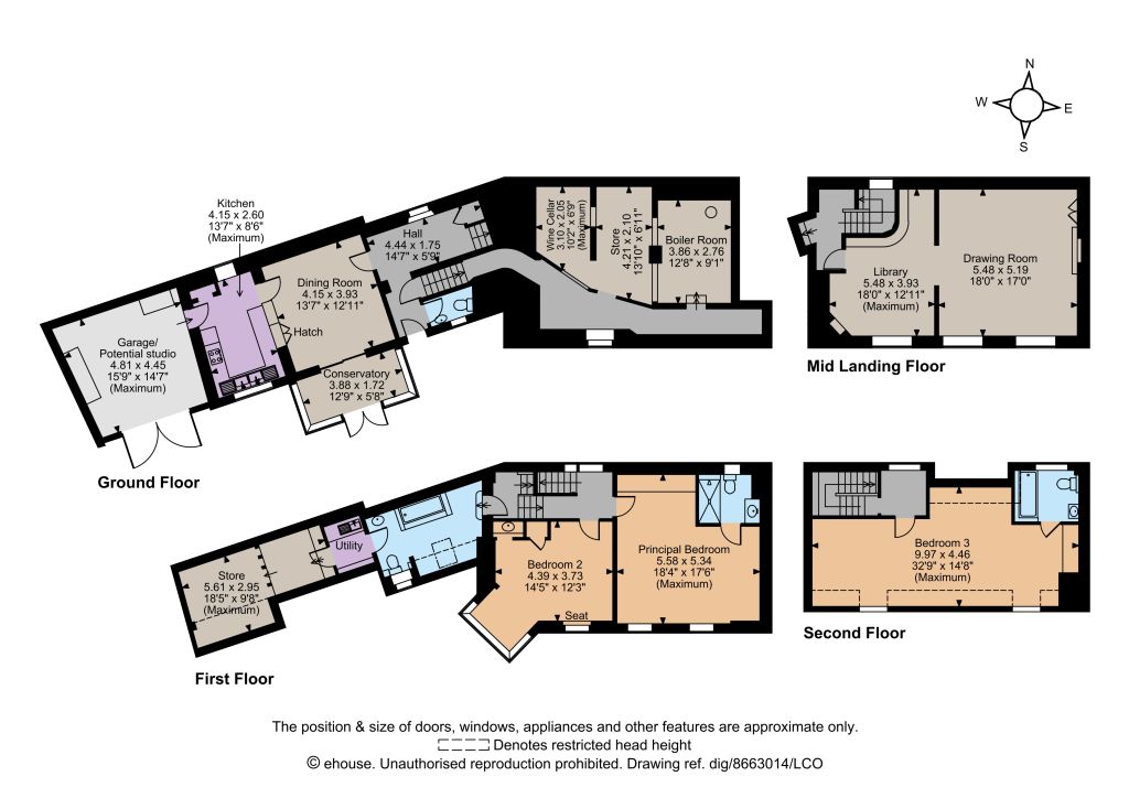 The ground floor has a welcoming entrance hall and a door leading to the splendid formal dining room, with all four walls adorned with delightful hand-painted scenery and sliding glass doors opening onto the sunny conservatory, which has a south-facing aspect and opens onto the paved courtyard garden via French doors. Adjoining the dining room is the kitchen with its fitted wooden units, integrated double oven and gas hob with grill and extractor hood. Stairs lead from the entrance hall down to the wine cellar, store and boiler room, while on the mid-landing level there are further reception rooms in the adjoining semi open-plan library and drawing room. Both rooms are connected via an open archway, creating a light and airy space in which to relax and entertain.