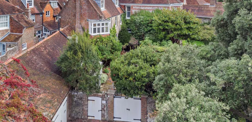 At the entrance to the property, a paved courtyard provides parking space and access to the double height garage (potential studio), with double gates for vehicles and a separate gate for pedestrian access, opening onto the south-facing courtyard walled garden. The garden includes brick and paved terracing, providing peaceful space for al fresco dining, shaded by mature trees and established shrubs and hedgerows for a sense of peace and privacy.