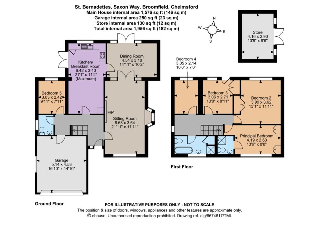 A generous first floor landing gives access to the property’s four remaining bathrooms and to a family bathroom with bath and separate shower enclosure.The front aspect principal bedroom has built-in storage and an en suite shower room. Two of the remaining bedrooms also benefit from built-in storage, one with a part-glazed door to a flat-roofed terrace area over the kitchen/breakfast and dining rooms.