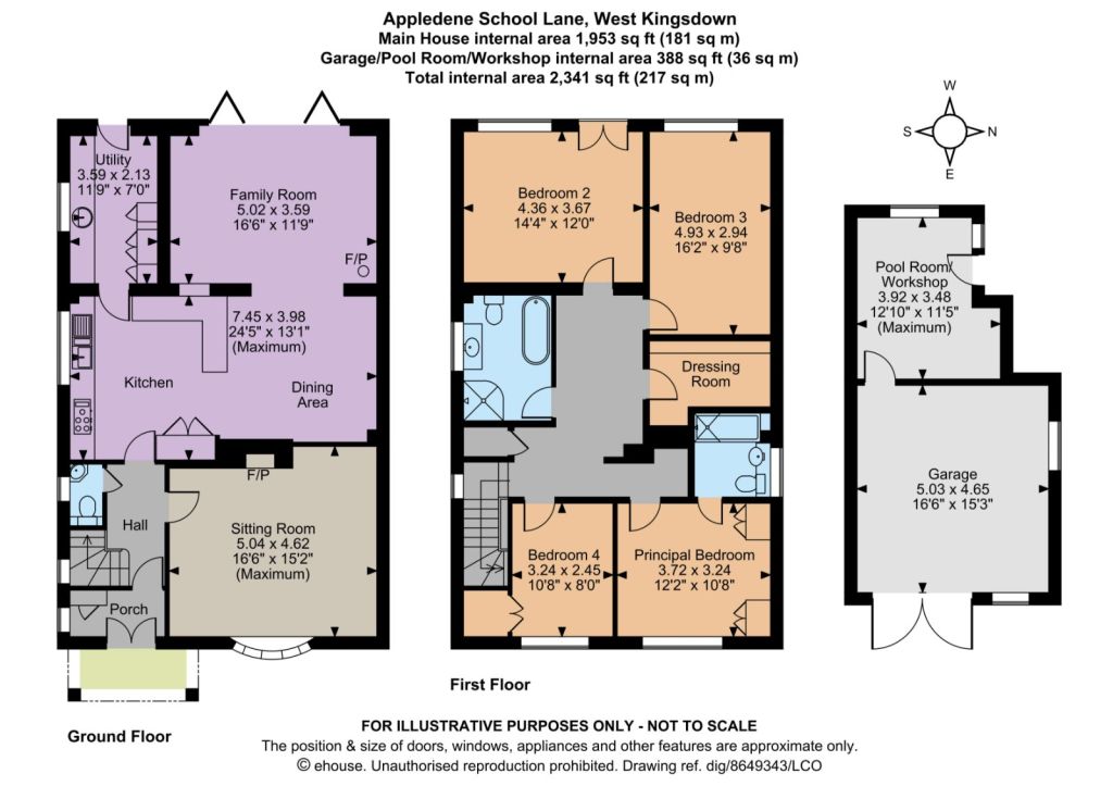 At the front of the property, a five-bar wooden gate opens onto a block-paved driveway, with plenty of parking space and a further gated entrance opening to the side, which leads to the detached garaging block for further parking and storage space, which has a pool room or workshop at its rear. The front gardens have an area of lawn, while at the rear there are sunny west-facing gardens, which extend to approximately 100ft and include a patio area across the back of the house, as well as a stunning, kidney-shaped heated swimming pool with its own sun terrace. Beyond the pool there is an area of lawn with border fencing, beds filled with various flowering perennials and, at the end of the garden, a chicken coop.