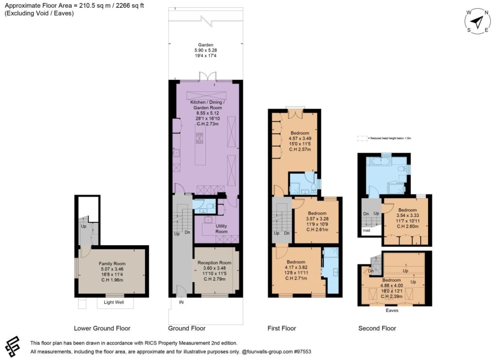 Upstairs, the principal bedroom boasts high ceilings, fitted wardrobes, French doors leading out to a Juliet balcony and a modern en-suite. A second en-suite double bedroom features south facing sash windows, with a further spacious double on this level. The top floor offers a family bathroom with bath and walk-in shower, two additional bedrooms with built-in storage, and extensive eaves space.