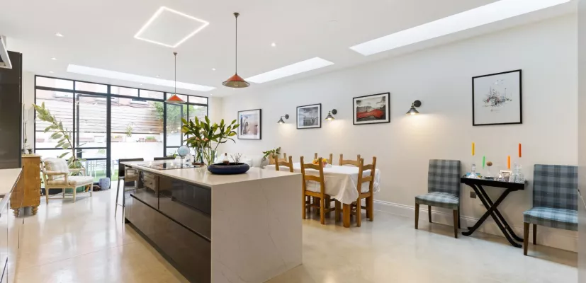 The ground floor features a striking open-plan kitchen and dining space, flooded with light from triple skylights and a full-height glazed rear wall. French doors open to the garden, creating a seamless indoor-outdoor flow. The sleek kitchen is fitted with premium appliances including a double oven, wine fridge, Quooker hot tap and water filter, with wiring in place for a sound system. The kitchen features polished concrete flooring and underfloor heating. There is also a utility room, guest WC and a front reception finished with oak flooring and bespoke storage.