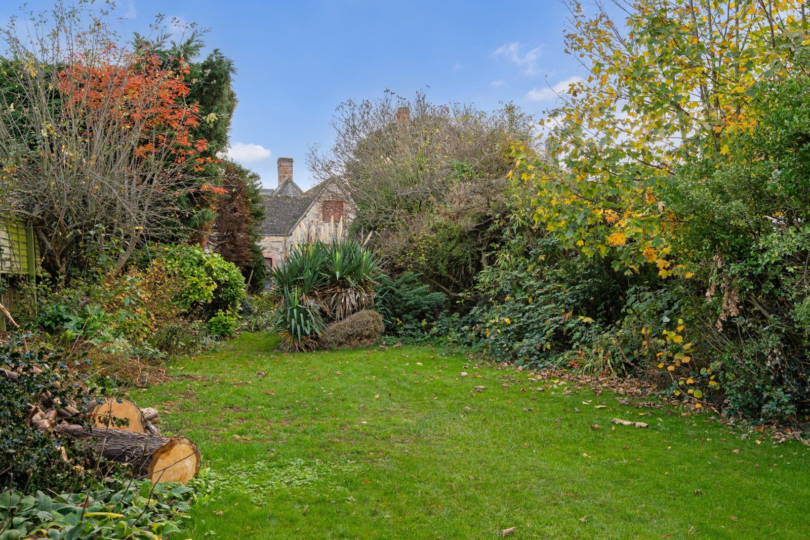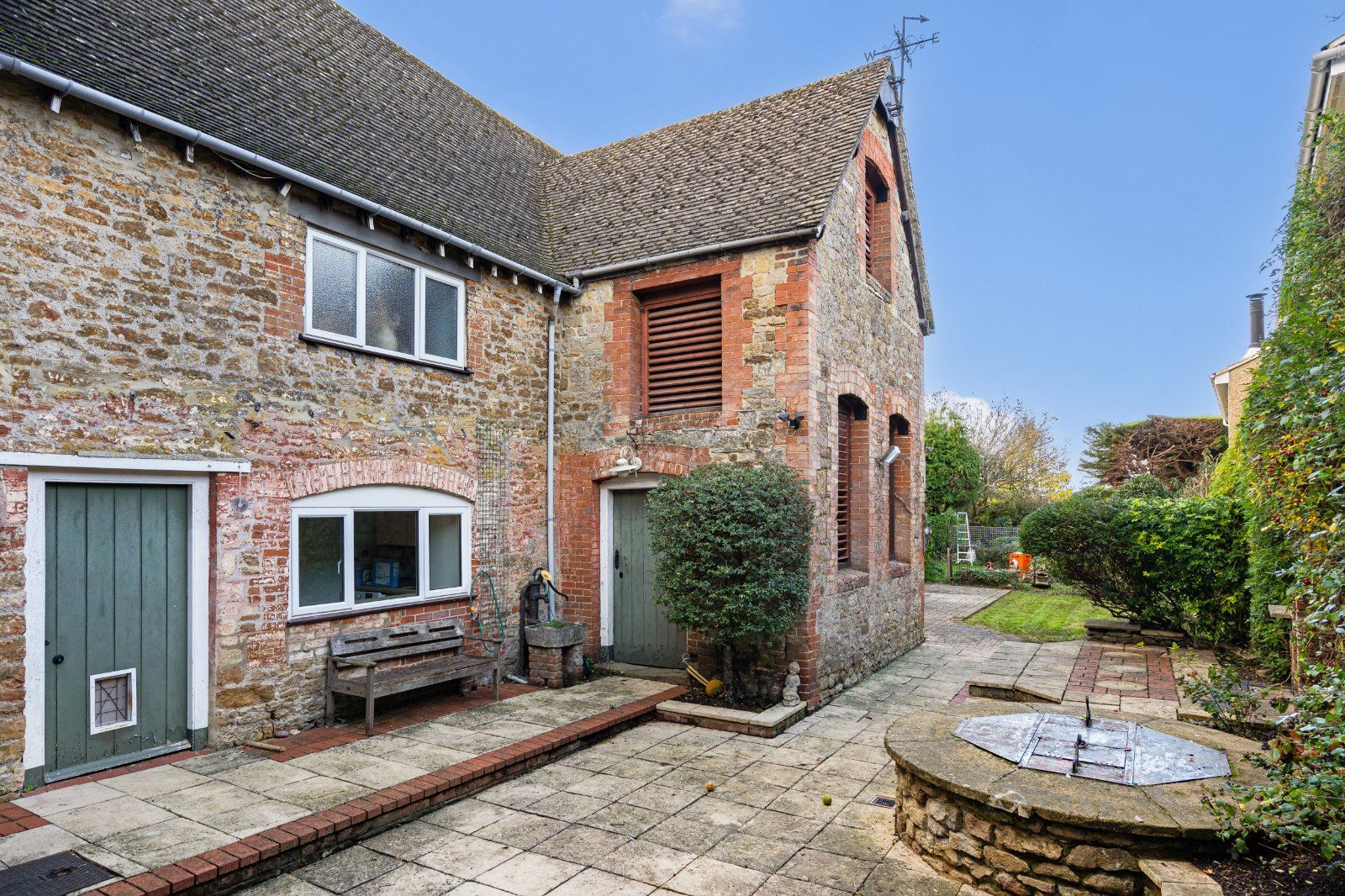Beyond the courtyard, the garden stretches into a long lawn framed by mature hedging and established trees.