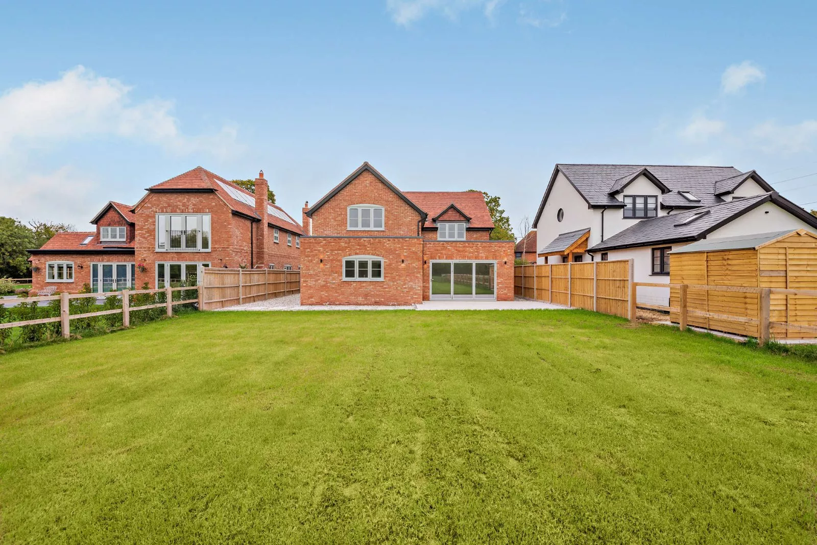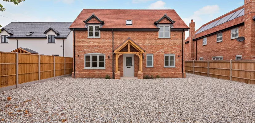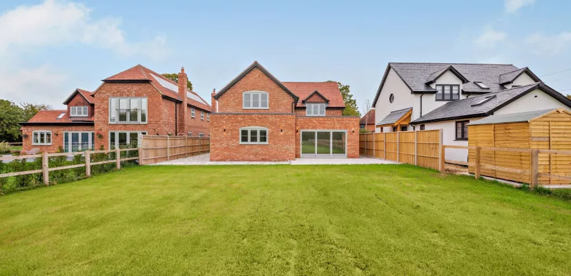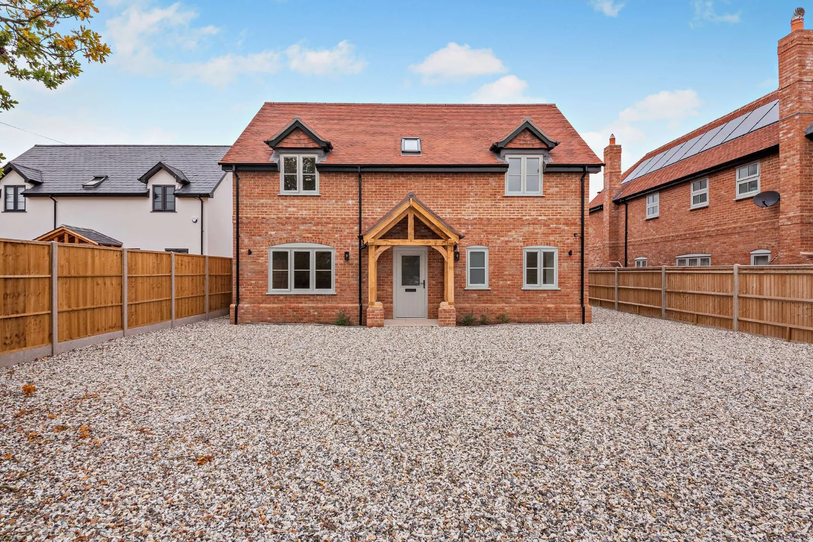 The property is approached via smart wooden gates across a gravel driveway, which provides parking for several vehicles. There is side access to the house and rear with EV charging point. The rear garden is mainly laid to lawn, with a landscaped porcelain patio and enclosed by post and rail fencing. The garden faces south-west and enjoys wonderful views of open fields to the rear.