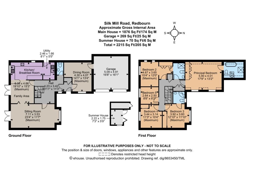 At the front of the property there is parking space on a shared block-paved driveway, as well as access to the integrated double garage for further parking or home storage and workshop space. The delightful garden to the rear is south-facing and welcomes plenty of sunlight throughout the day. It includes a patio across the back of the house with a retractable sunshade. Beyond the patio there is an area of lawn with colourful, well-stocked border beds and, at the end of the plot, a gravel seating area and summer house, providing a peaceful vantage point from which to enjoy the garden.