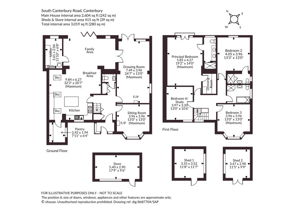 Complementing this space are two further reception rooms: a generous drawing room and a separate sitting room, both featuring fireplaces. The sitting room benefits from an elegant bay window, while the drawing room has direct access to the family area and opens to the rear garden via French doors. Practical requirements are well catered for, with a large utility room, a dedicated boiler room, a walk-in pantry and a cloakroom.