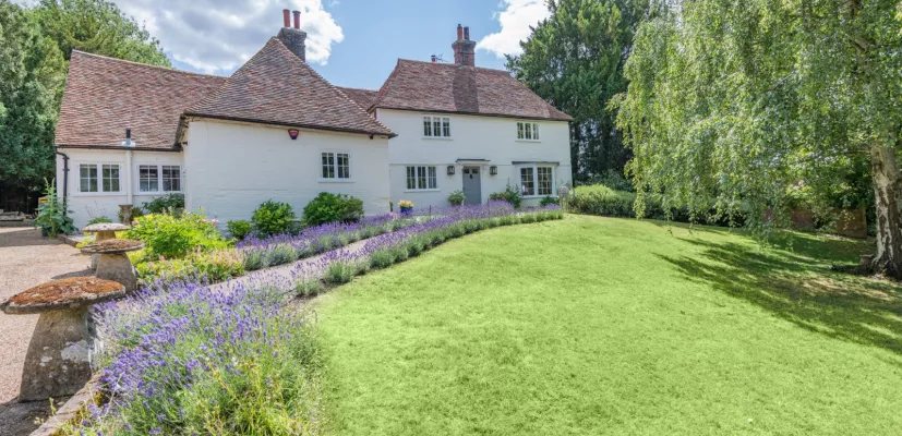 The property is approached through a five-bar gate to a gravel drive which passes an expanse of lawn planted with mature trees and continues to the house, annexe and garaging. The gardens and views to the ancient church provide a quintessentially English, backdrop and a beautiful environment for the house. A path flanked by lavender leads to the front door. Behind the house and adjacent to the kitchen a sheltered terrace, also planted with a mass of lavender, has a pretty outlook to the church tower.