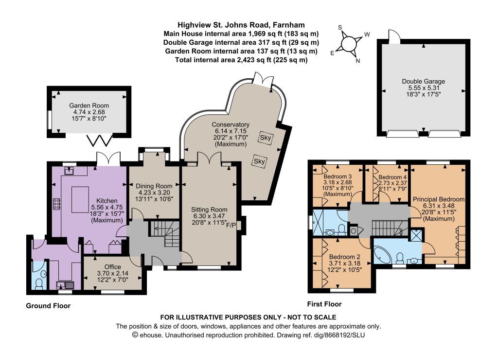 Constructed of variegated brick, Highview is a handsome part tile-hung double-fronted family home offering almost 2,000 sq ft of light-filled, flexible accommodation arranged over two floors. Configured to provide a practical and cohesive living and entertaining environment, the property provides modern amenities, quality fixtures and fittings including contemporary sanitaryware and elegant neutral décor throughout. The ground floor accommodation flows from a welcoming wooden-floored reception hall with stairs rising to the first floor. It briefly comprises a front aspect office, a dining room with a large bay window overlooking the rear garden and a dual aspect sitting room with a contemporary wall-mounted inset fireplace. Glazed double doors open from the sitting room to a vaulted conservatory with feature exposed brick walls, wooden flooring and large picture and Velux glazing, both admitting a wealth of natural light and the former incorporating French doors to the garden terrace. The ground floor accommodation is completed by a kitchen with tiled flooring and a range of contemporary wooden wall and base units. It includes a central island, complementary work surfaces and splashbacks. There is also space for a table for informal dining, French doors opening to the terrace, and an interconnecting fitted utility room with an en suite cloakroom and a door to the garden. On the first floor the property offers a dual aspect principal bedroom with fitted dressing area and a wooden-floored en suite bathroom with corner bath and separate shower enclosure. Three further well-proportioned bedrooms, all with built-in storage, and a family shower room, complete the accommodation.