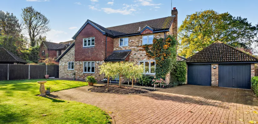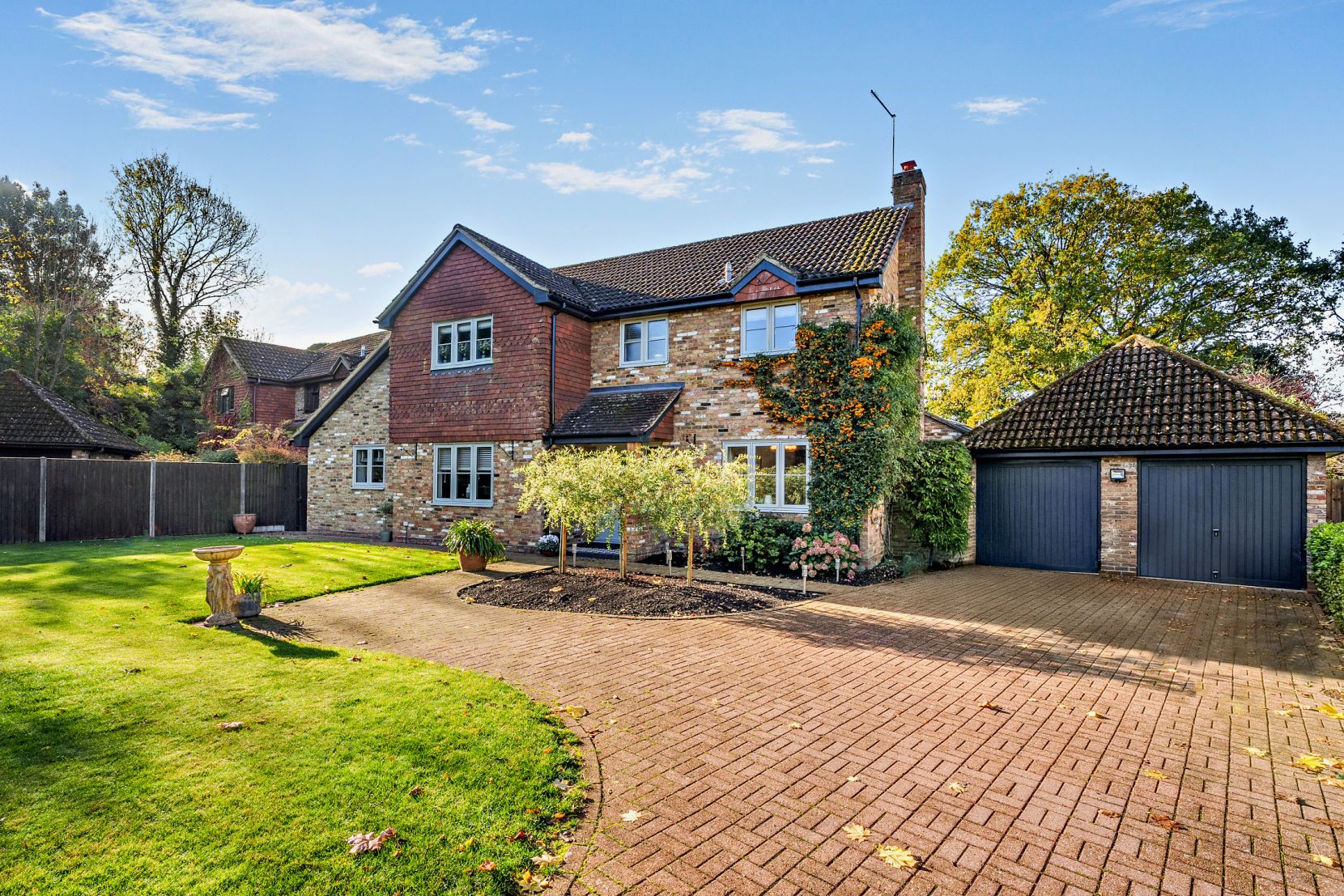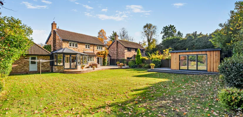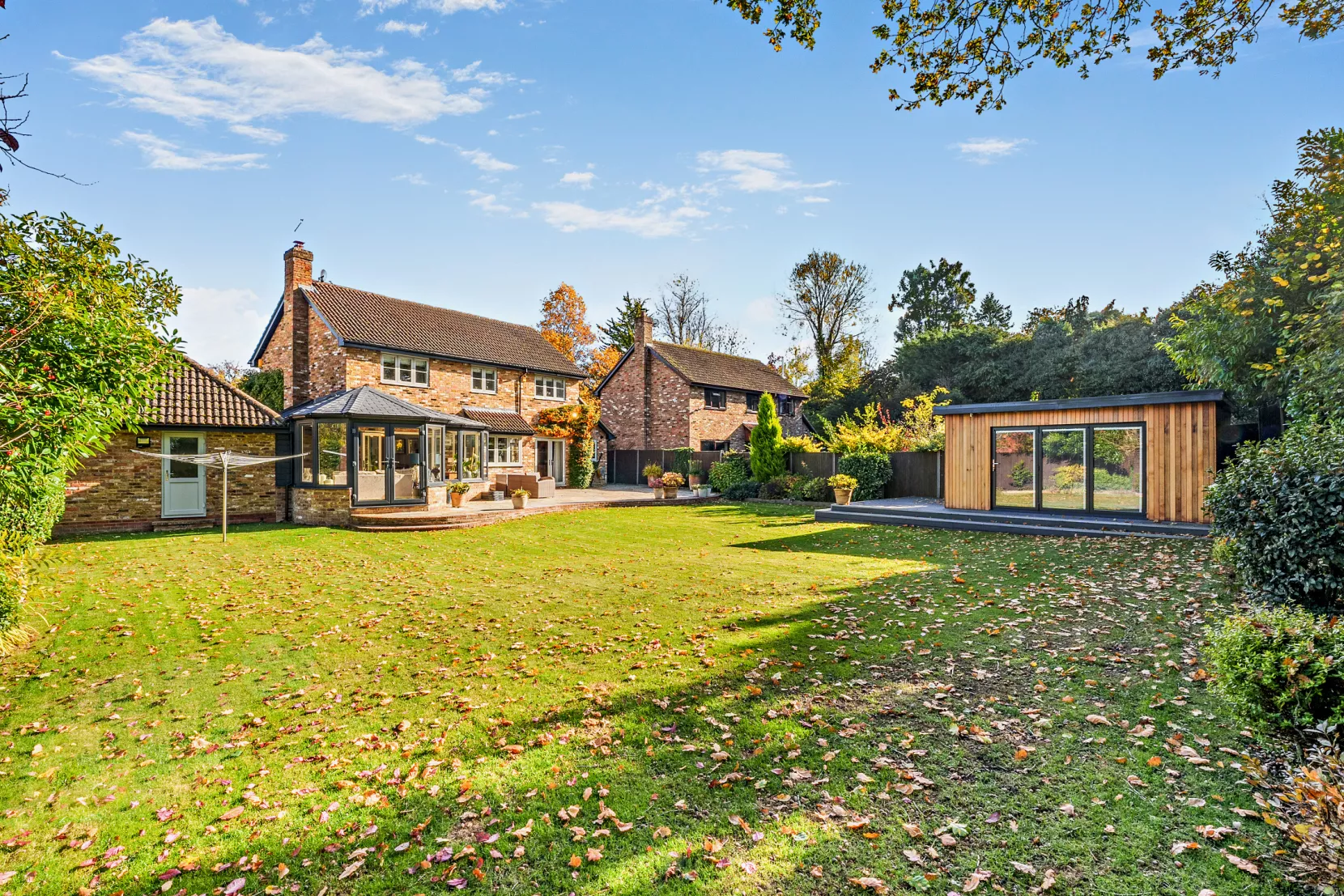 Set behind mature hedging and level lawn and having plenty of kerb appeal, the property is approached over a block-paved driveway providing private parking and giving access to the detached double garage. The generous well-maintained and enclosed landscaped garden to the rear faces almost directly to the south, maximising exposure to the sunlight. It is laid mainly to level lawn bordered by well-stocked flower and shrub beds. It features a weatherboarded garden room with full-height glazing, wooden flooring and bi-fold doors to a decked terrace, currently configured for use as a gym but suitable for a variety of uses including as a studio or office space, together with a generous raised paved terrace accessible from the kitchen/breakfast room and conservatory, ideal for entertaining and al fresco dining.