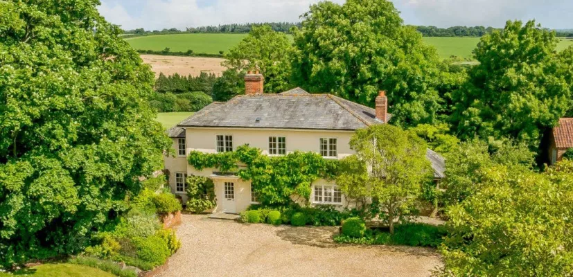 The house is situated in an elevated position overlooking the Bourne Valley and the charming garden is situated on the south west side of the house taking advantage of the afternoon and evening sunshine, and views across the valley. The garden is bounded by an attractive brick and flint wall, and is mainly laid to lawn, edged with mixed herbaceous borders and surrounded by mature shrubs, hedges and trees. There is a delightful and secluded York stone terrace area outside the kitchen and drawing room.