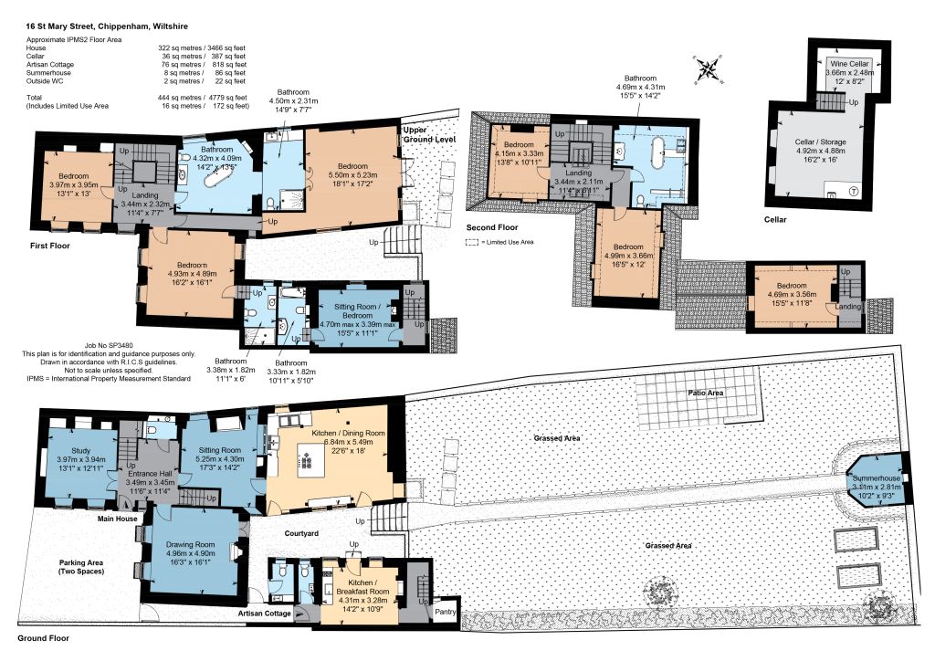 The impressive entrance hall, with its exposed galleried staircase and Bath stone flooring, creates a striking first impression. The ground floor accommodation is thoughtfully arranged and includes a drawing room, a separate sitting room with a working stone fireplace, a charming study, and a stylish handcrafted kitchen/dining room with exposed stone walls. There is also a wine cellar and guest cloakroom. All principal rooms feature working fireplaces.