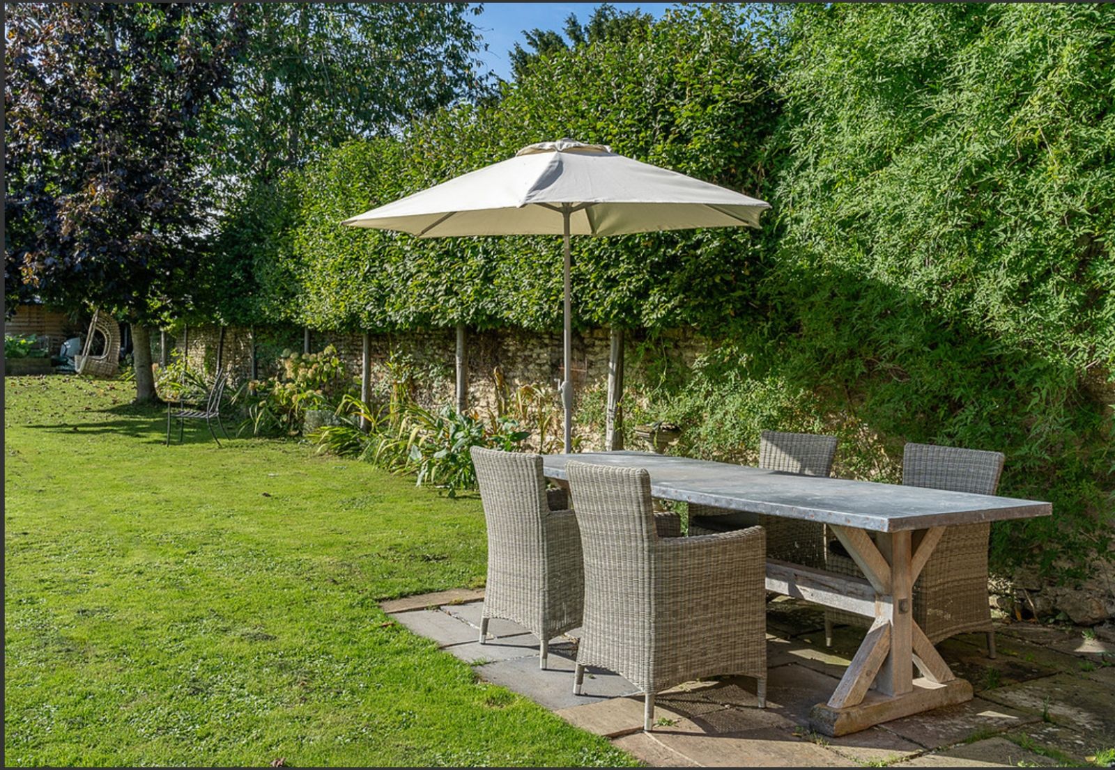 At the far end of the garden stands a Grade II listed 19th-century gazebo, sympathetically converted with an inviting open fireplace, creating a flexible space for work or relaxation throughout the year.