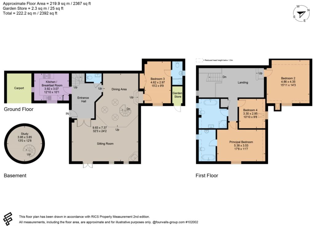 There are three bedrooms on the first floor, including a principal bedroom with en suite featuring a roll top bath, two further good-size bedrooms and a family bathroom with both bath and shower. Downstairs there is a fourth double bedroom with en suite shower room.