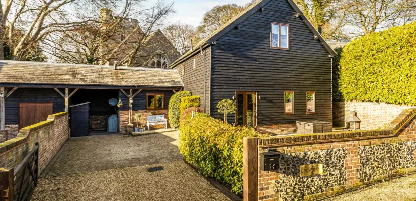 The barn is set within a pretty, private road which leads to the three attached adjoining barns, with shared allocated parking to the front. There is landscaped space around the property, including lovely grassland and views to the village church at the rear. To the front of the house, a five-bar gate opens to a generous driveway leading up to an attached carport. The lawned garden is accessed from the sitting room and is enclosed by a high brick wall for privacy, with a number of shrubs providing interest. A generous patio terrace is accessed from the sitting room and offers plenty of space for outdoor dining.