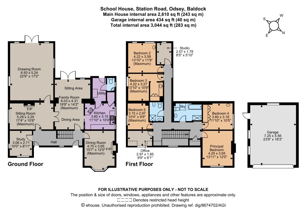 The part-vaulted first floor houses a front aspect study, a rear aspect office, five bedrooms, three with useful sinks and one room also having a fitted dressing area, together with a fully tiled family shower room and a separate family bathroom with bath and separate shower enclosure.