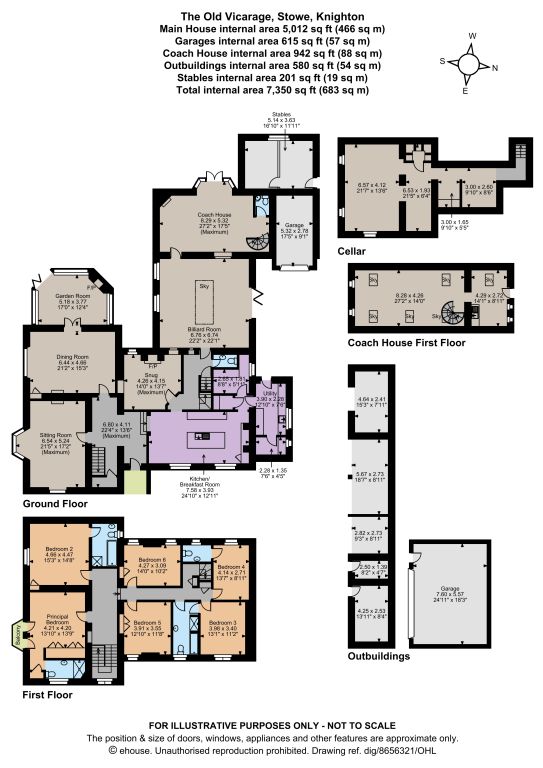 The ground floor offers five comfortable and spacious reception rooms, including the dual aspect sitting room, with its bay window and shutters revealing the wonderful views, and its tiled fireplace lending the space a sense of warmth and cosiness. There is a generous and well-proportioned dining room with ornate cornicing, ceiling rose, and tall sash windows. A pretty garden room is accessed from here. There is a cosy snug with a log burner and billiard room, beyond. This has a large ceiling lantern skylight and bi-fold doors, providing further space in which to relax or entertain. The Coach House is used as overflow entertaining space and storage, but given the relevant planning permission could be used as ancillary accommodation and comprises a sitting area with spiral stairs to a first floor along with a kitchen area. Also on the ground floor, the well-equipped kitchen with its exposed timber beams, has shaker-style units, a central island and integrated appliances, including dual ovens and a six burner gas hob, along with a very useful pantry. A separate utility room is adjacent with a wok burner, large sink and space for washing and drying machines along with a back door to the courtyard. Beneath the main house there are extensive cellars. Two staircases lead to the first floor, off which there are six well presented double bedrooms. These include the principal bedroom with its built in storage, en suite shower room and doors opening to the spectacular south-facing balcony. One further bedroom has an en suite bathroom, another has an en suite toilet and the remaining three bedrooms are served by the family bathroom.