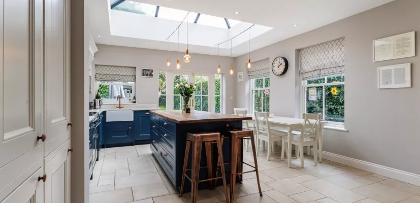 The property The refurbishment has updated the house while keeping to the traditional layout and elegant lines of the era: there is ample space for families, with well-proportioned reception rooms and a generous kitchen extension to the rear which creates a fantastic open plan living space. The entrance hallway, which has been skilfully restored back to its Edwardian heyday, provides a stylish welcome, with the front door opening to a tiled floor, decorative plasterwork and wall panelling. Clever storage under the stairs provides space to keep shoes and bags tucked away. The two reception rooms at the front of the house include a sitting room with wood-burning stove and a snug with built-in joinery that makes a great spot for family movie nights. The kitchen is filled with light thanks to a roof lantern and French doors leading out to the garden. Elegant blue and cream cabinetry is accented by copper hardware and a Belfast sink. Appliances include a Rangemaster oven, a wine cooler, microwave and Bosch dishwasher, all seamlessly integrated into the design, with a separate utility room for laundry machines. Upstairs, there are three good-size bedrooms and a family bathroom on the first floor and a principal bedroom with en suite shower room on the second floor, the latter with useful eaves storage.