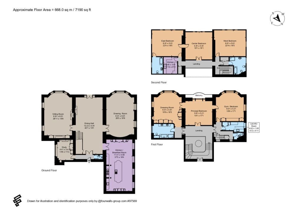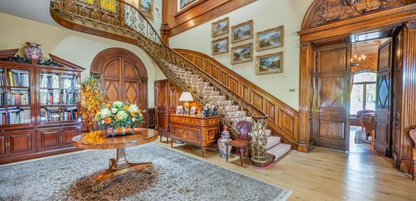 The property is arranged on a grand scale with beautifully generous yet balanced proportions, with the soaring elevations accented by Ionic columns, tall bay windows and an imposing entrance topped with a Venetian window. Internally the house is sumptuously, exhibiting all the grandeur and opulence of the time. High ceilings and tall sash windows afford a feeling of space, while solid oak doors, pilasters and ornate fireplaces have been beautifully restored in the same style as the original mansion. Of particular note is the exceptional dining hall, a stunning room with a beautiful, gilded ceiling, carved wood details and a magnificent staircase leading up to a stained glass window. One of the walls features an intricately painted Italianate-style mural of the building in its historic heyday, while the imposing staircase also features 17th-century inspired murals and a roof lantern.