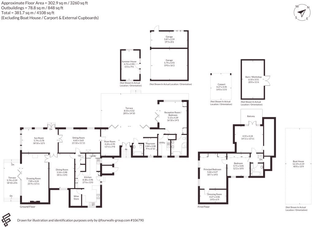 There are two raised, paved terraces, linked to reception rooms, south and west facing to capture the majority of the day’s sunshine, but with the advantage of two extendable awnings allowing plenty of cool shade in the summer. A pretty summer house exists with power and the wet boathouse and launch slip, also with power, is tucked neatly into the far corner of the plot with again potential to be further developed and made more of a feature. In addition, for water enthusiasts is a modern jetty mooring with steps down into the river for paddleboarding and swimming. Importantly the Thames Path is located on the opposite bank, which particularly in summer months, is well screened from view by trees, granting even greater privacy and a sense of tranquillity. The property is registered under two title plans, presenting potential—subject to planning consent—for division and the addition of a further dwelling