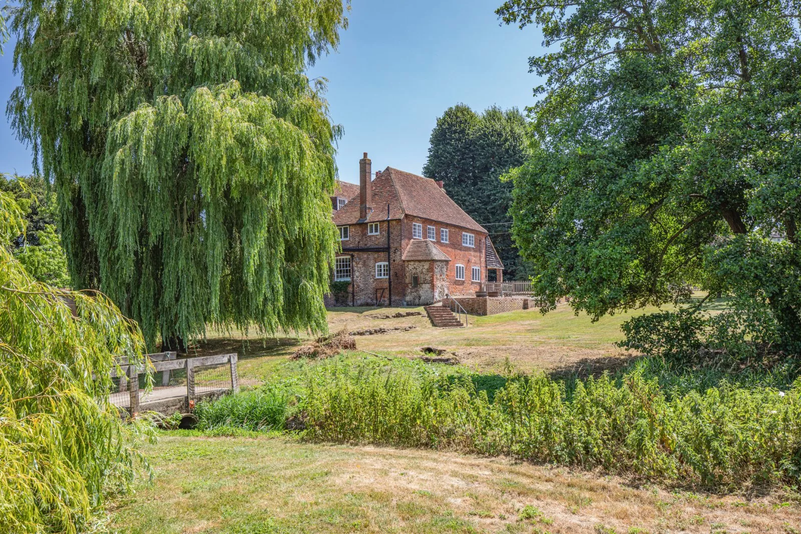 A small tributary of the Great Stour runs through the grounds, creating a natural island with beautiful country views, accessed by a footbridge. A large paved rear terrace offers an ideal space for entertaining and al fresco dining whilst enjoying the far-reaching rural views.