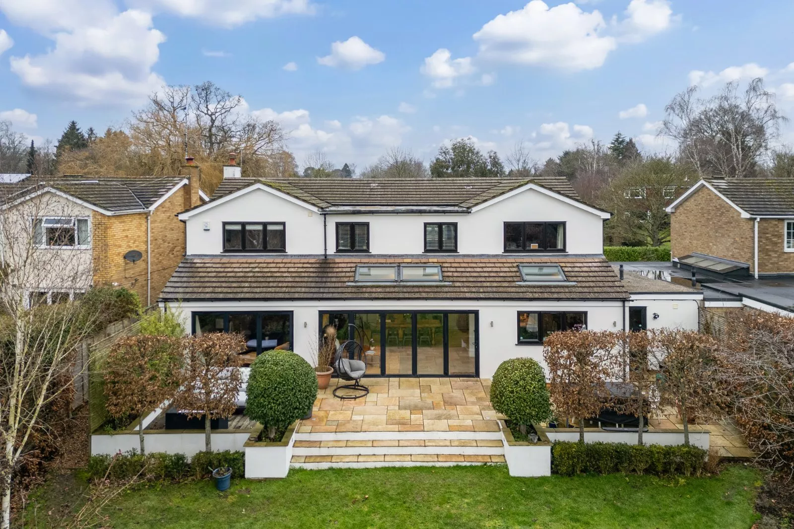 To the rear, the large south-facing garden is a particular highlight and perfectly designed for family life. An expansive lawn provides ample space for children to play, in addition to a dedicated, bark-mulched children’s play area. The garden has been thoughtfully curated to provide both structure and year-round interest, with elegant beech hedging, pleached hornbeams and sculpted Portuguese laurels creating a sense of privacy and refinement. Specimen trees including Himalayan birch, crab apple and Tibetan cherry add seasonal colour and a profusion of blossoms through spring.