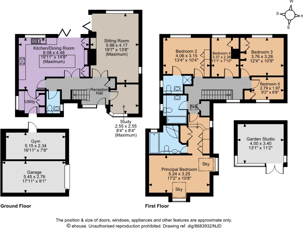 On the first floor, the accommodation is equally impressive. The light-filled principal bedroom features vaulted ceilings, skylights, and a modern en suite bathroom. Four further well-proportioned bedrooms provide flexible space for a growing family, served by a stylish family bathroom , as well as an additional en suite shower room to the second bedroom.