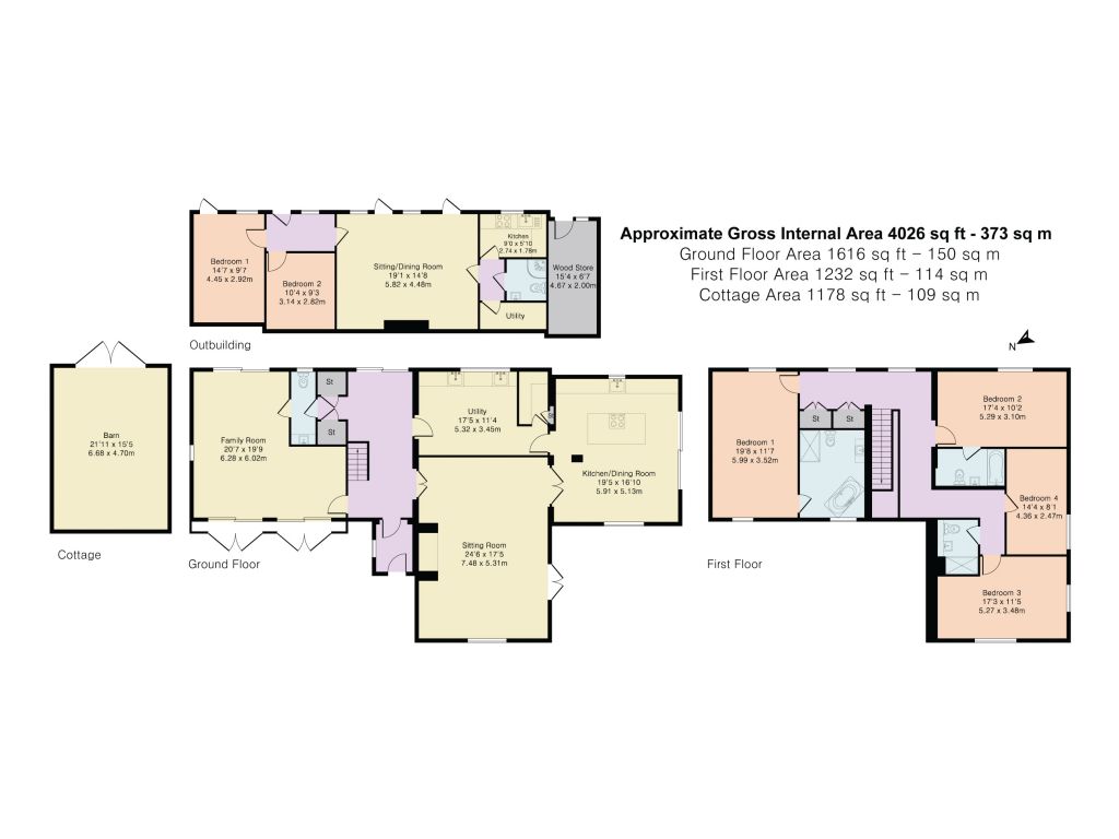 The ground floor features a bright entrance hall leading to a vaulted kitchen/dining room with bespoke cabinetry, high-quality appliances, and a central island. A spacious utility room adds practicality, while the sitting room, complete with a wood-burning stove and large windows, provides a welcoming space. A separate family room offers additional living space, ideal for children or guests. A cloakroom completes the ground floor accommodation.