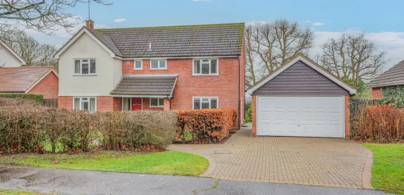 Located in a quiet no-through road and set behind an area of level lawn screened by mature hedging, the property is approached over a block-paved side driveway. It provides private parking and gives access to the detached double garage adjacent to the house. A wrought iron pedestrian gate opens from the driveway to the property’s side aspect and rear garden beyond, while a herringbone-paved path bisecting the lawned front garden leads to the storm porch and front door. The generous well-maintained south-facing garden to the rear is laid mainly to gently-sloping lawn interspersed with and bordered by mature flower and shrub beds, hedging and trees. It features a generous raised paved terrace accessible from the sitting room, ideal for entertaining and al fresco dining.