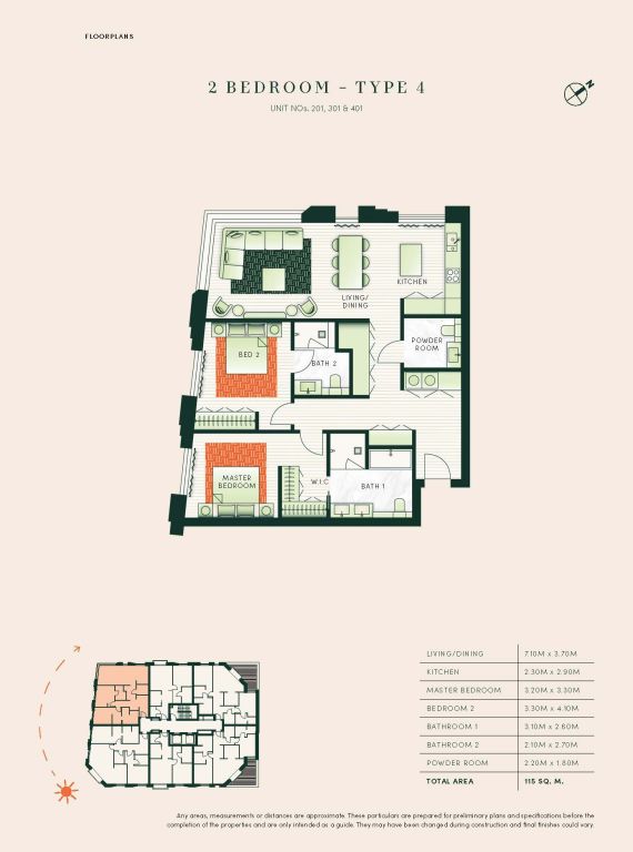 The apartment benefits from two generous and evenly sized double bedrooms, both with ensuites and a separate powder room. The property is complete with engineered oak flooring and air-conditioning throughout.