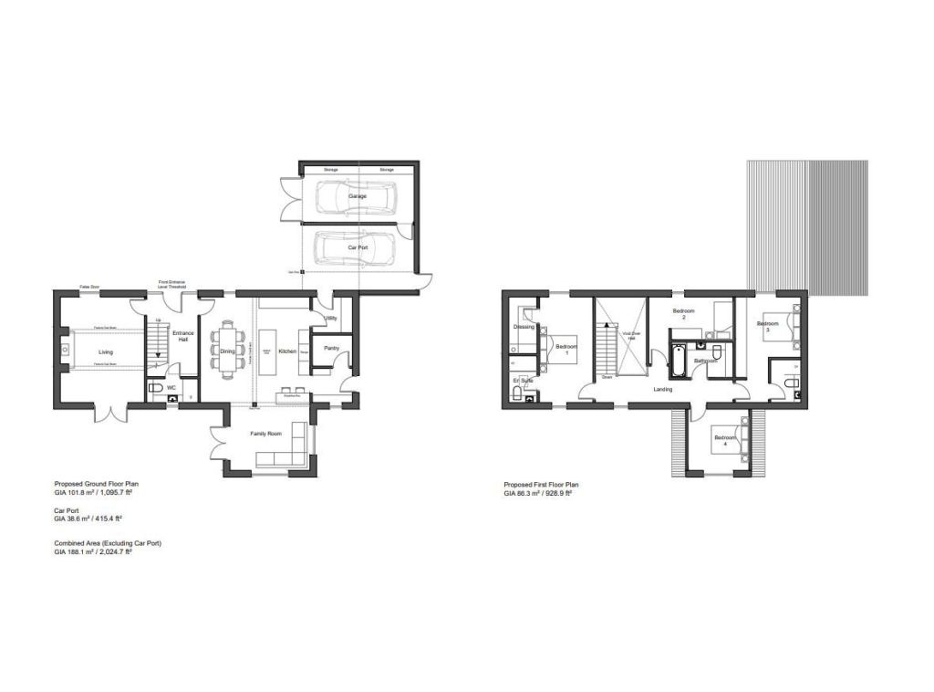 Plot 3 An attractive detached home with double width garage/carbarn of about 2024 square feet (GIA) following the style of a Threshing Barn. On the ground floor the accommodation consists of kitchen/dining room, utility room, pantry, sitting room and family room. All four bedrooms are positioned on the first floor, two of which have end suites, the principal bedroom also has a dressing room.