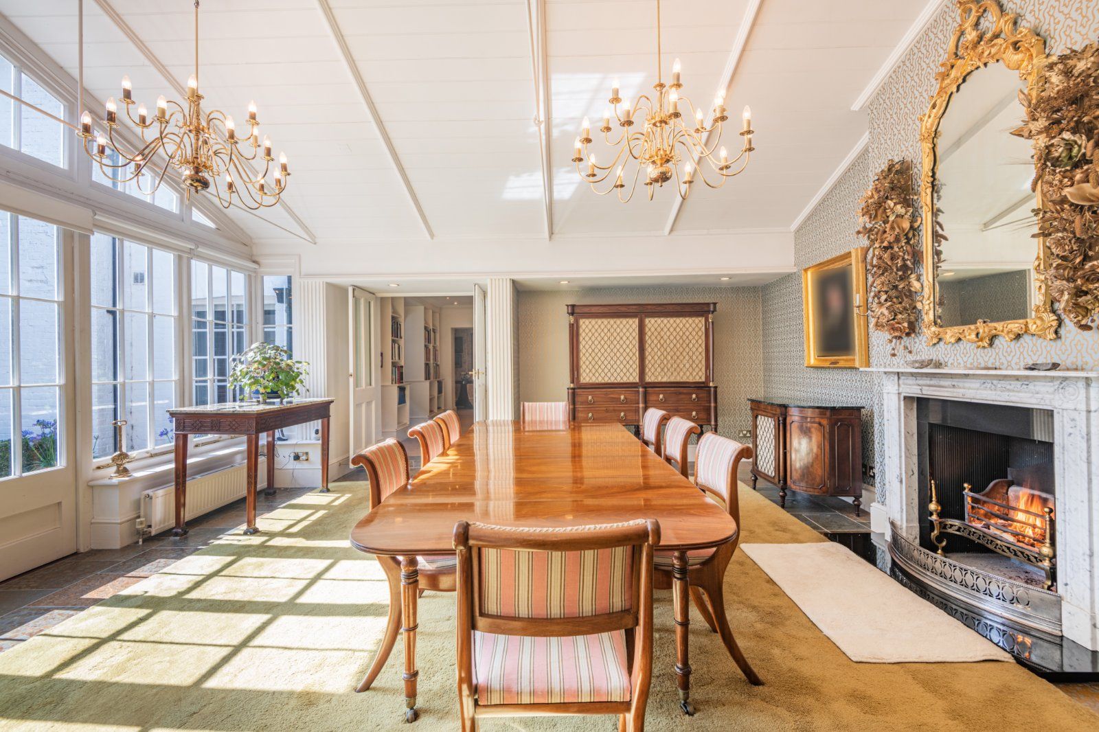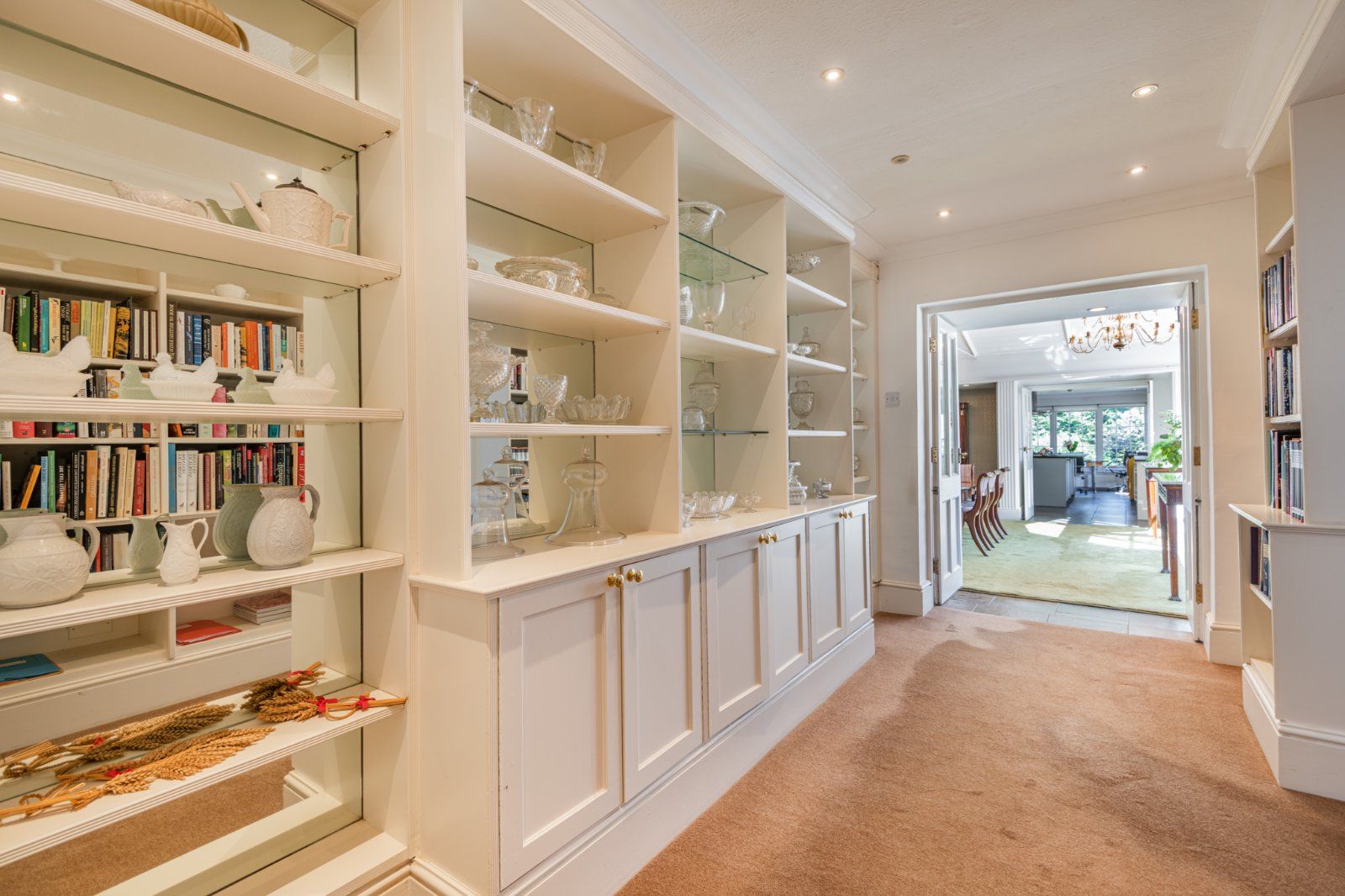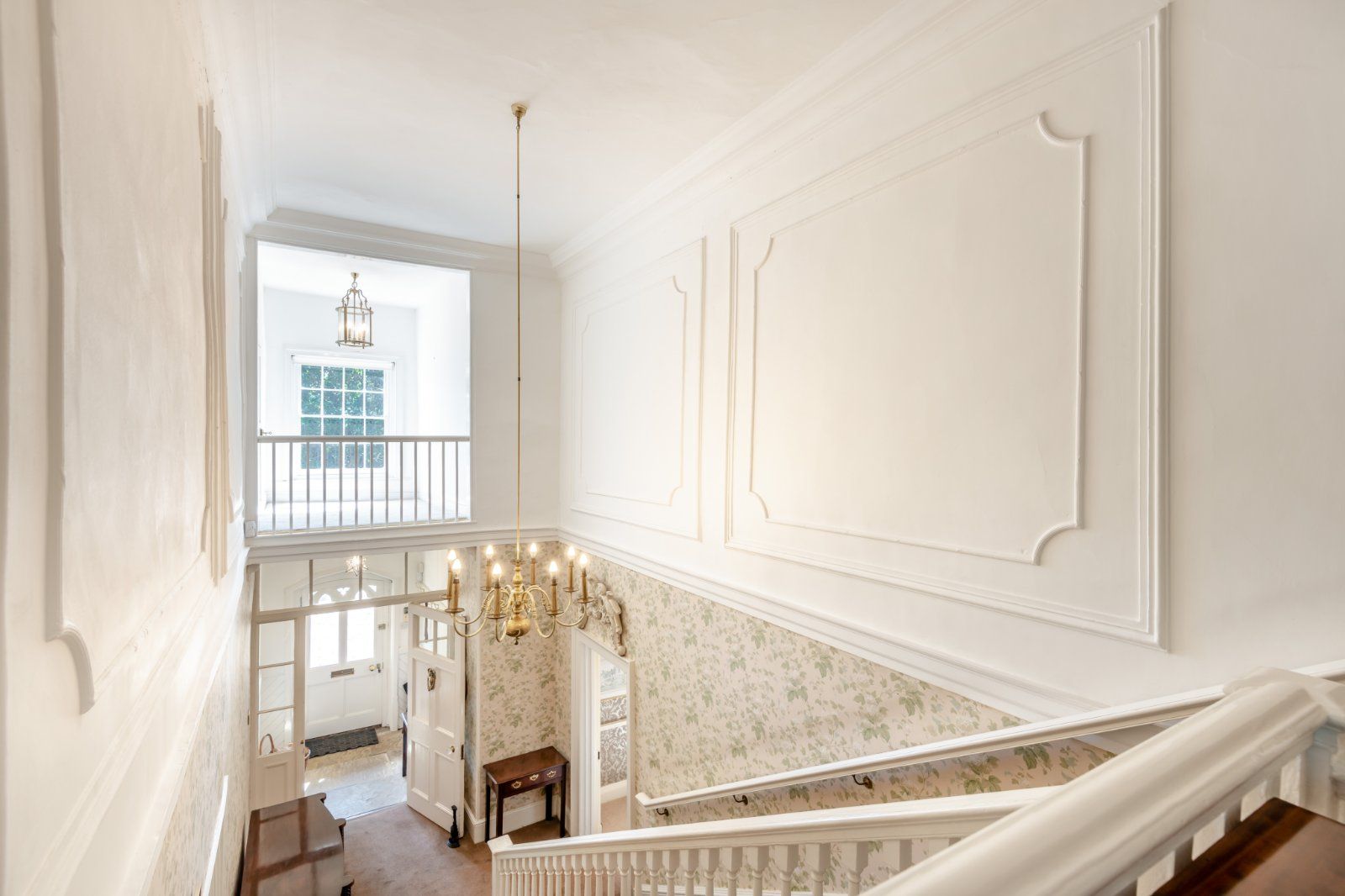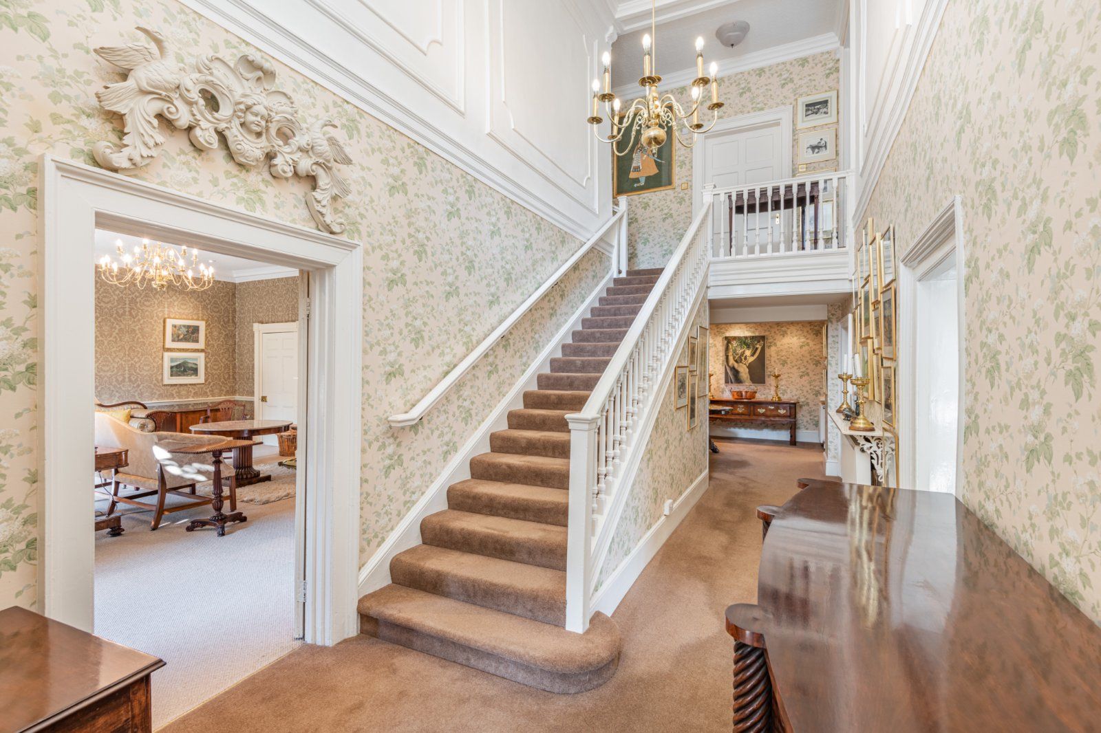 The porch opens to a double-height reception hall, with an elegant easy-rising staircase and wall panelling. To the right there is a handsome morning room with bay window and fireplace, and to the left a beautifully proportioned drawing room with high, corniced ceilings and a classic marble fireplace surround. Doors either side of the fireplace open to a rear corridor which leads to a library full of charm and atmosphere with a chamfered beamed ceiling and deep brick fireplace. Returning along the corridor there is a wine store and a cloakroom.
