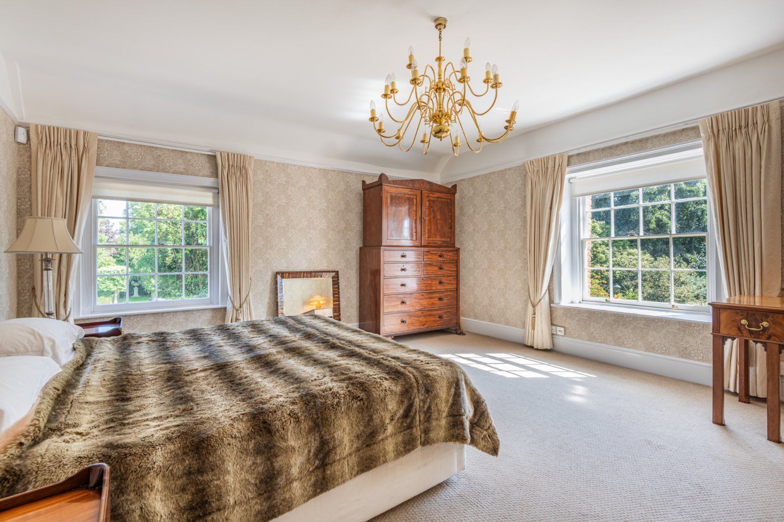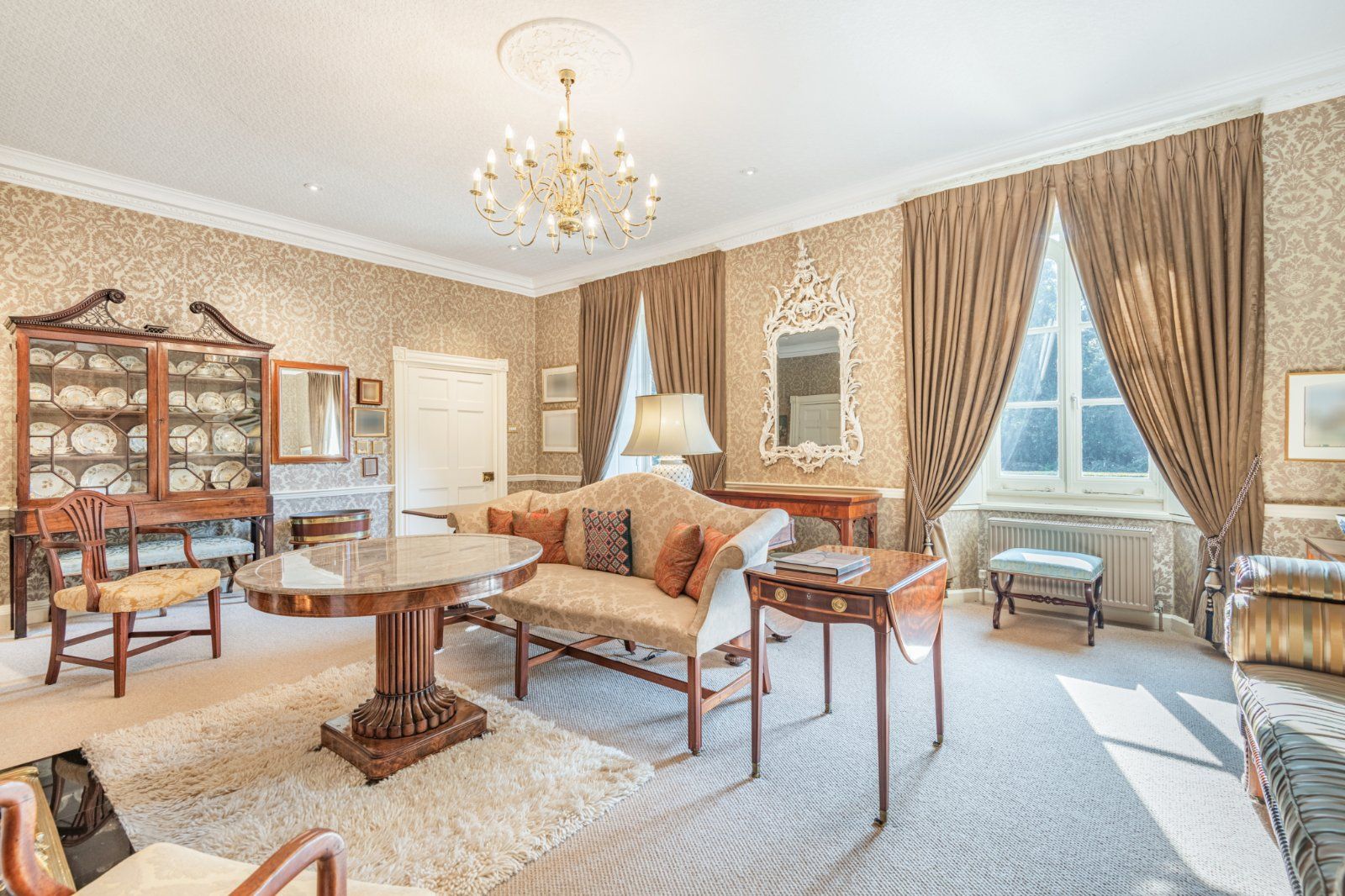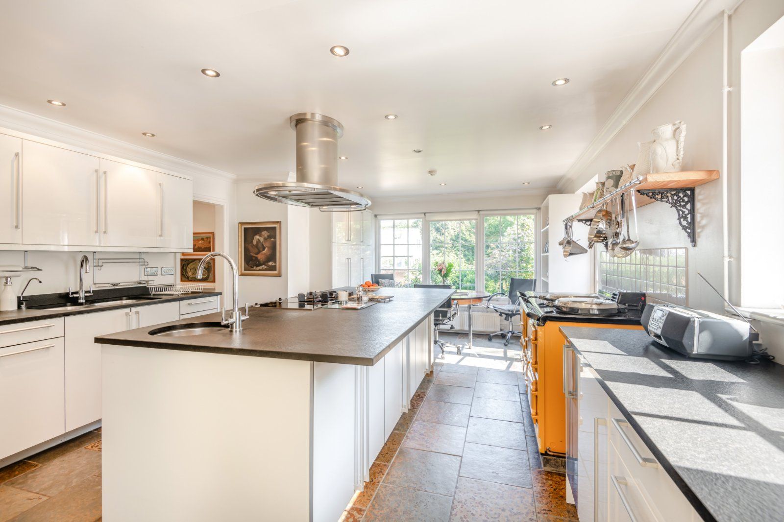 The spacious and sociable kitchen has a large central island, with a range of contemporary cabinetry, a variety of integrated appliances and a four-oven gas AGA. Separate scullery, larder, laundry and linen rooms, together with a well-appointed utility, boot room and cloakroom all adjoin.