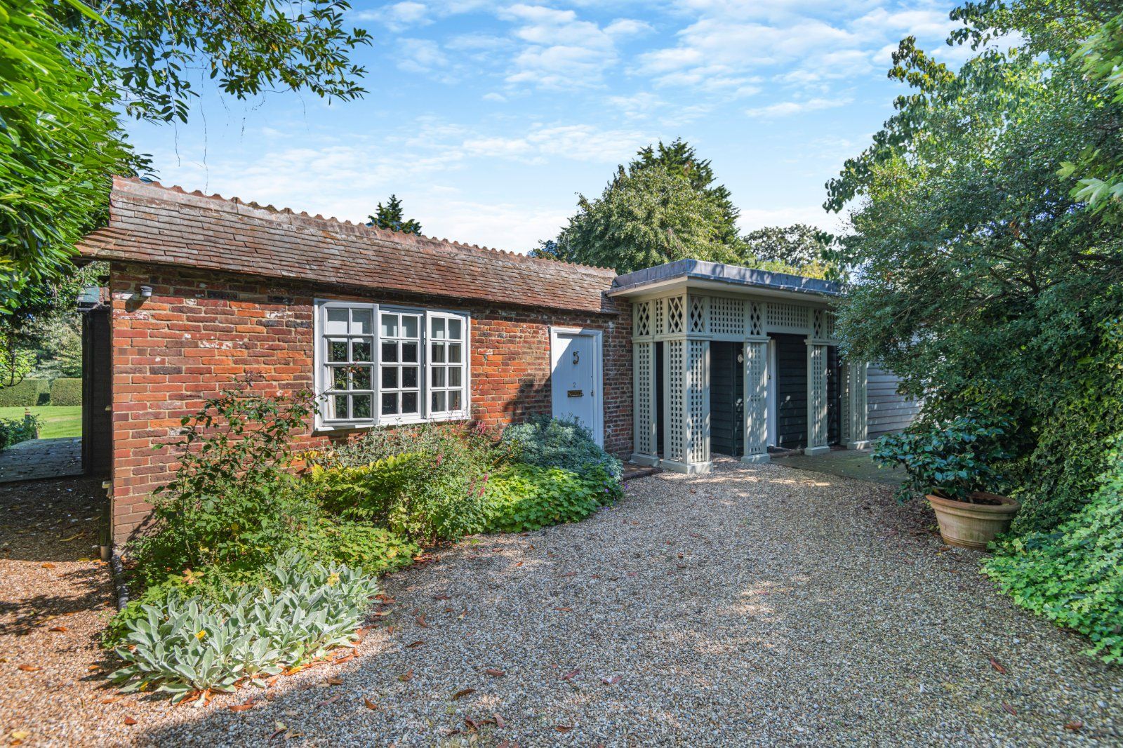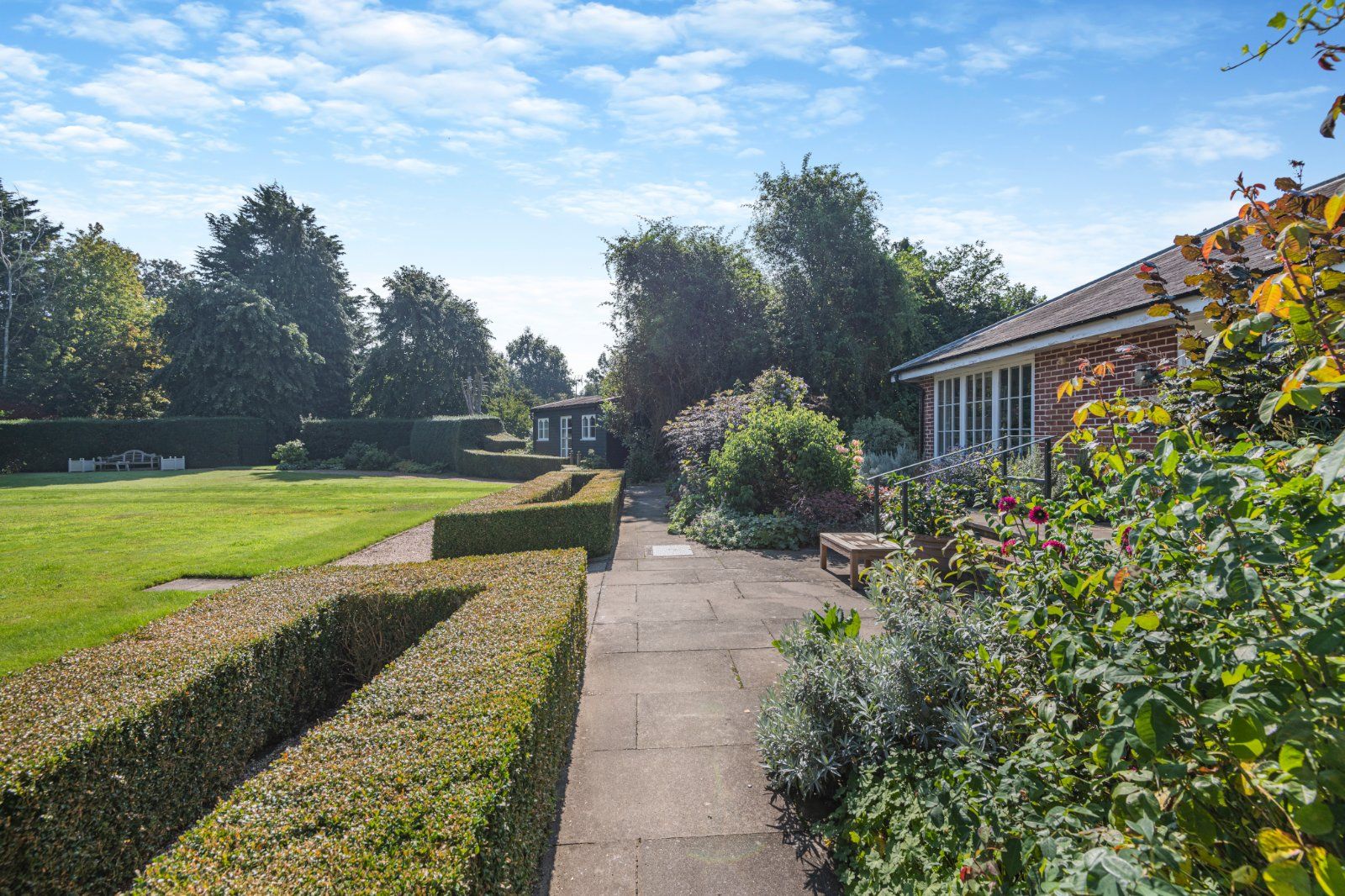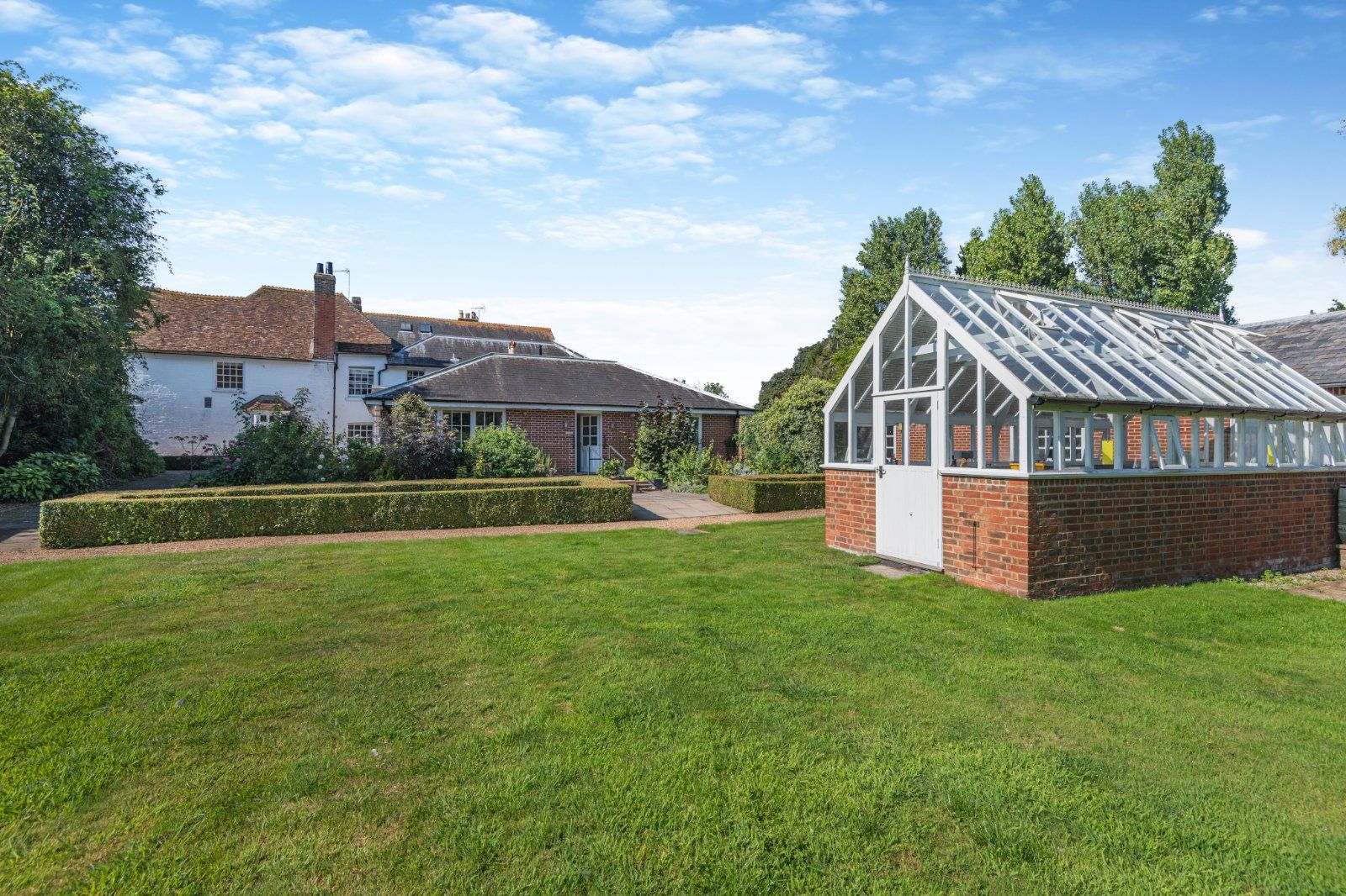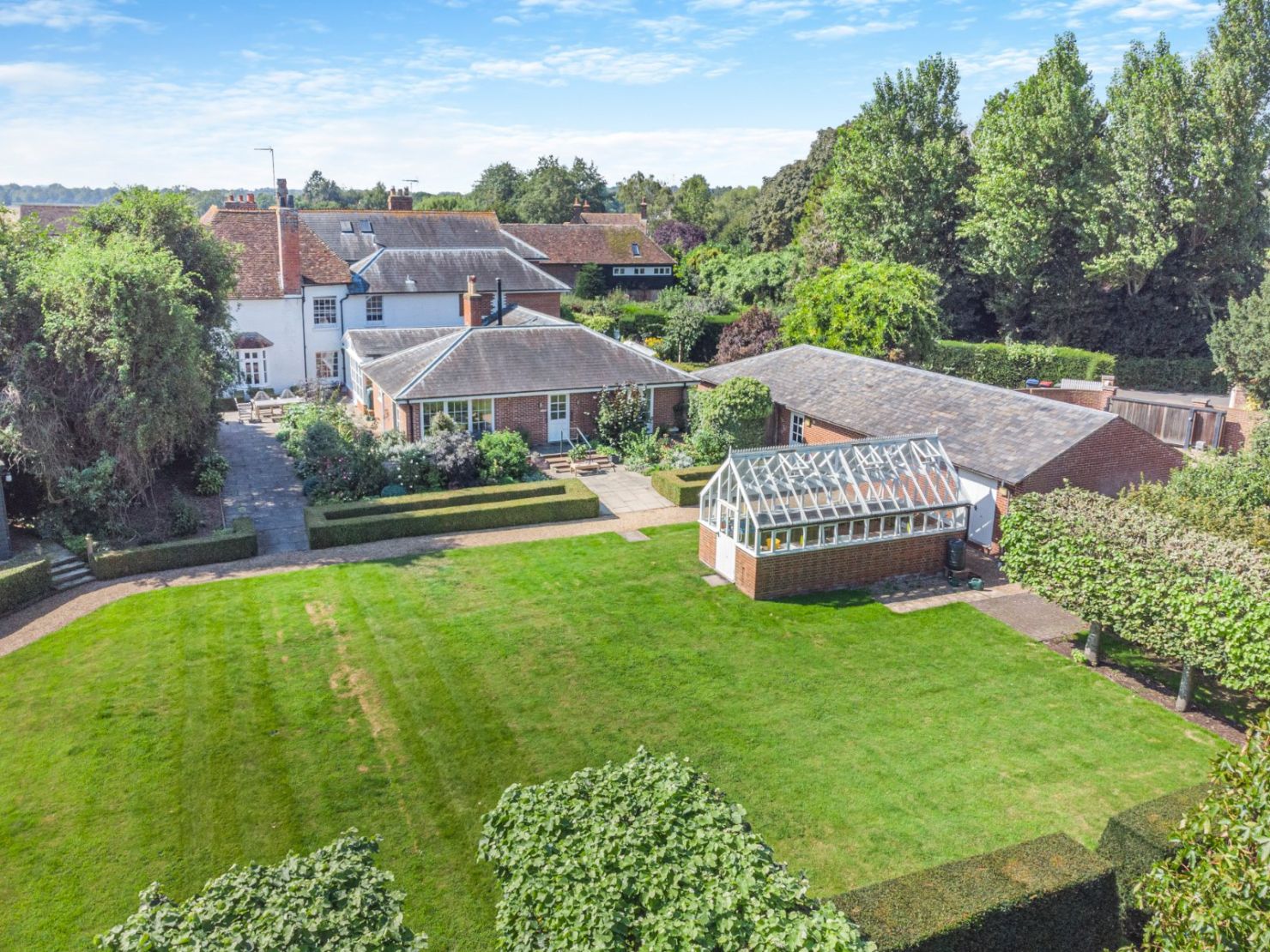The garden has been expertly designed and landscaped to give high levels of privacy. From the kitchen, steps lead down to a wide, paved terrace bounded by neatly manicured box hedging; a further terrace can be accessed from the dining room. The large level lawn is bounded by pleached trees, with a short avenue of trees forming a focal point opposite the main house. A Victorian style greenhouse is adjacent.