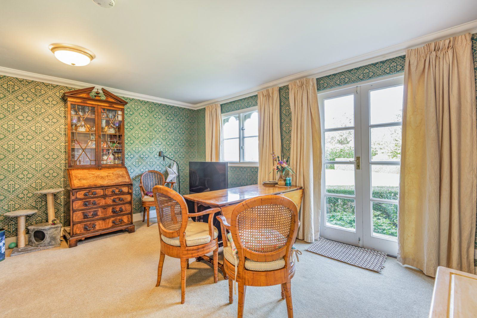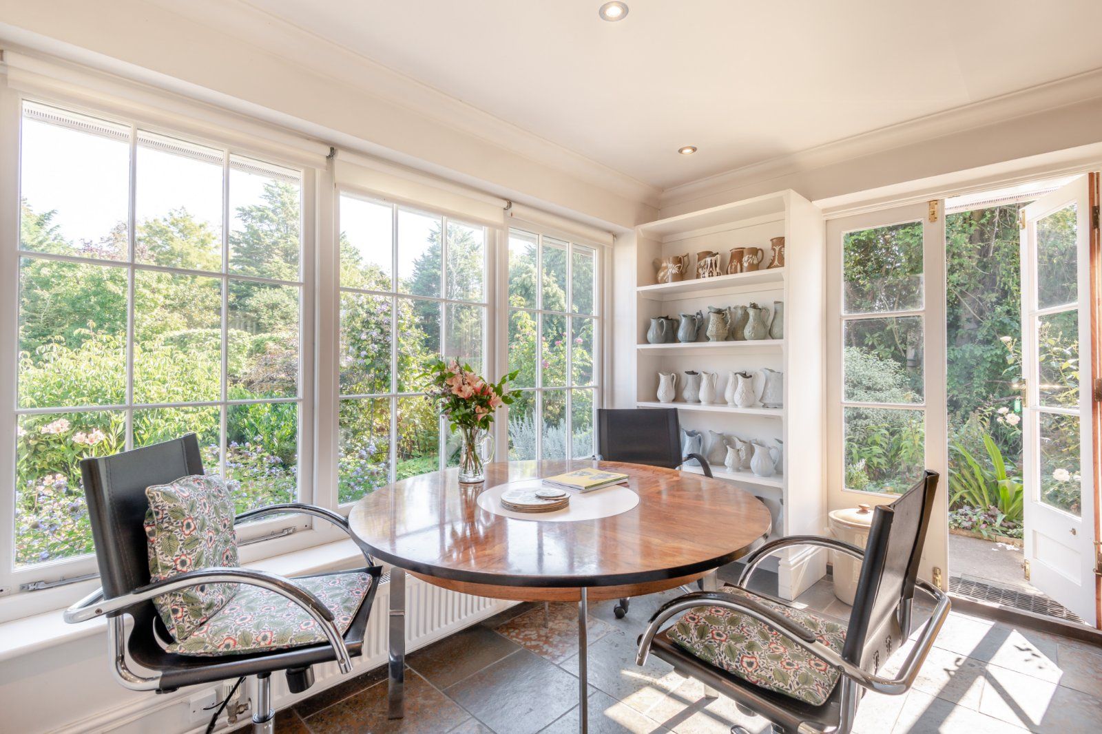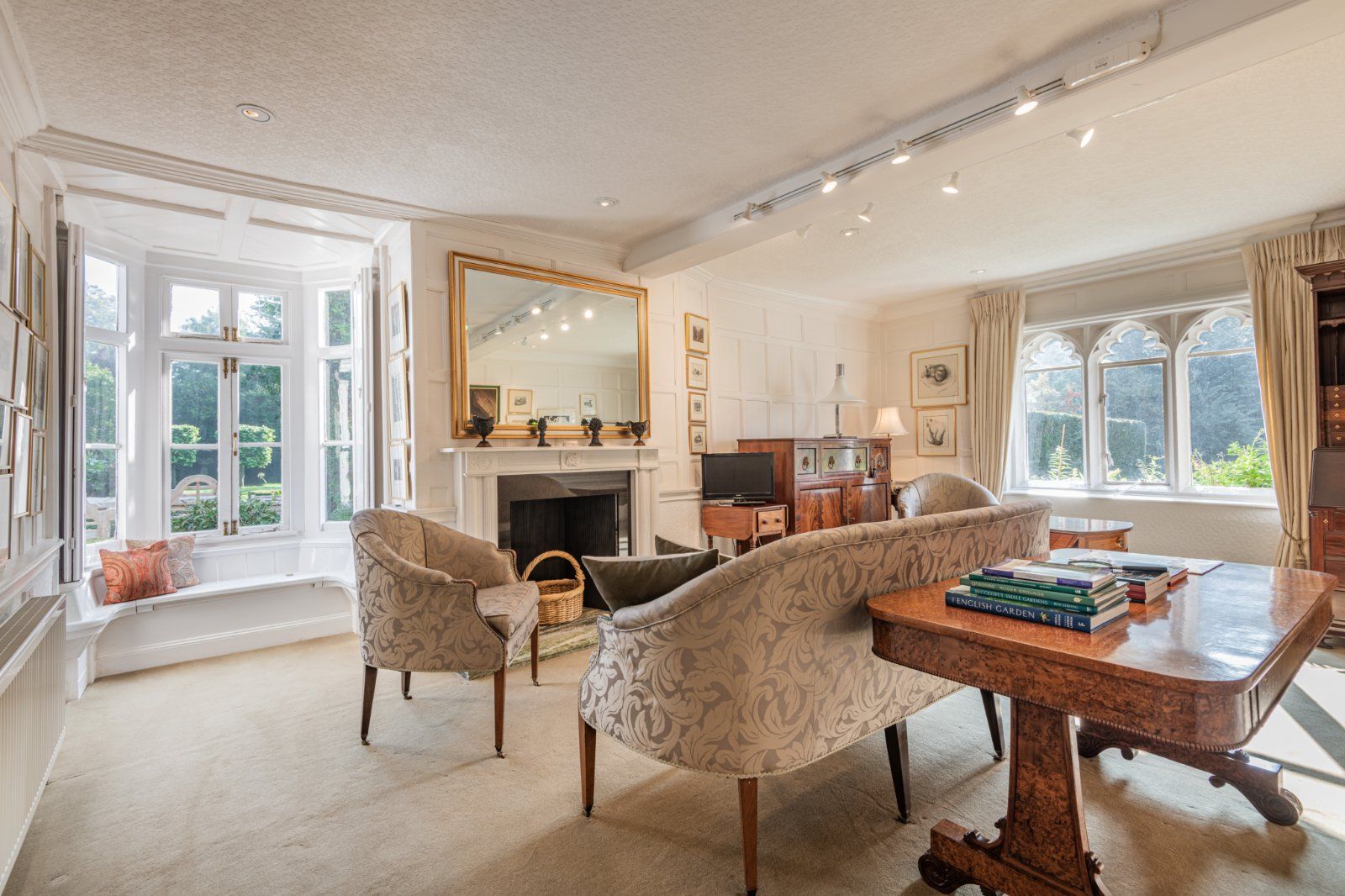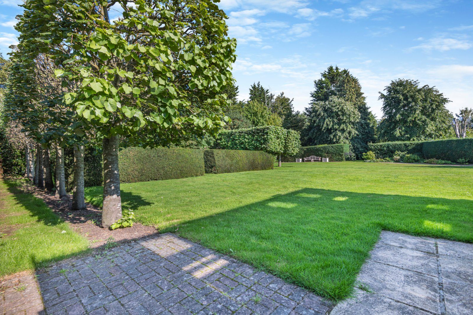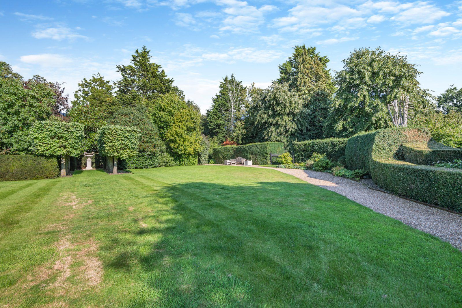 The garden has been expertly designed and landscaped to give high levels of privacy. From the kitchen, steps lead down to a wide, paved terrace bounded by neatly manicured box hedging; a further terrace can be accessed from the dining room. The large level lawn is bounded by pleached trees, with a short avenue of trees forming a focal point opposite the main house. A Victorian style greenhouse is adjacent.