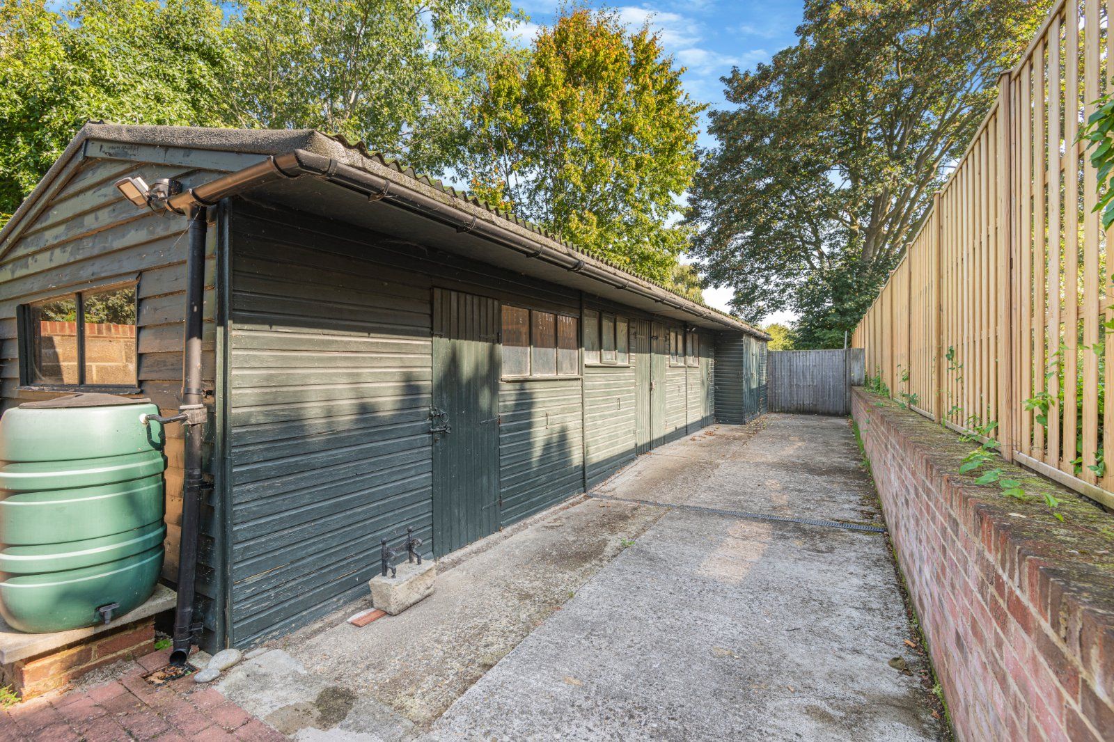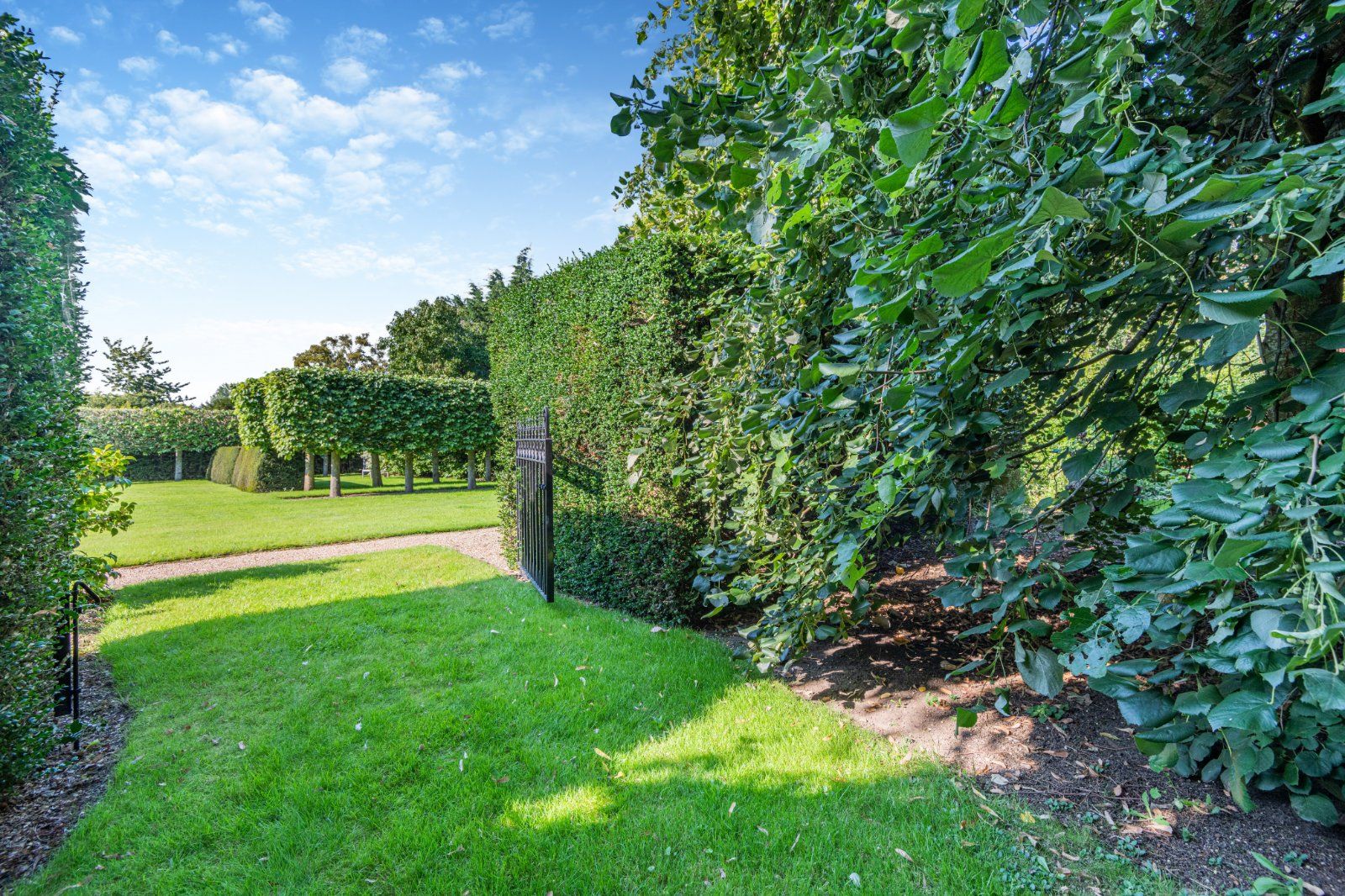 Accessed through a wrought iron gate is a further lawned area with a number of beautiful specimen trees. Beyond is the former stable block – now used for storage.