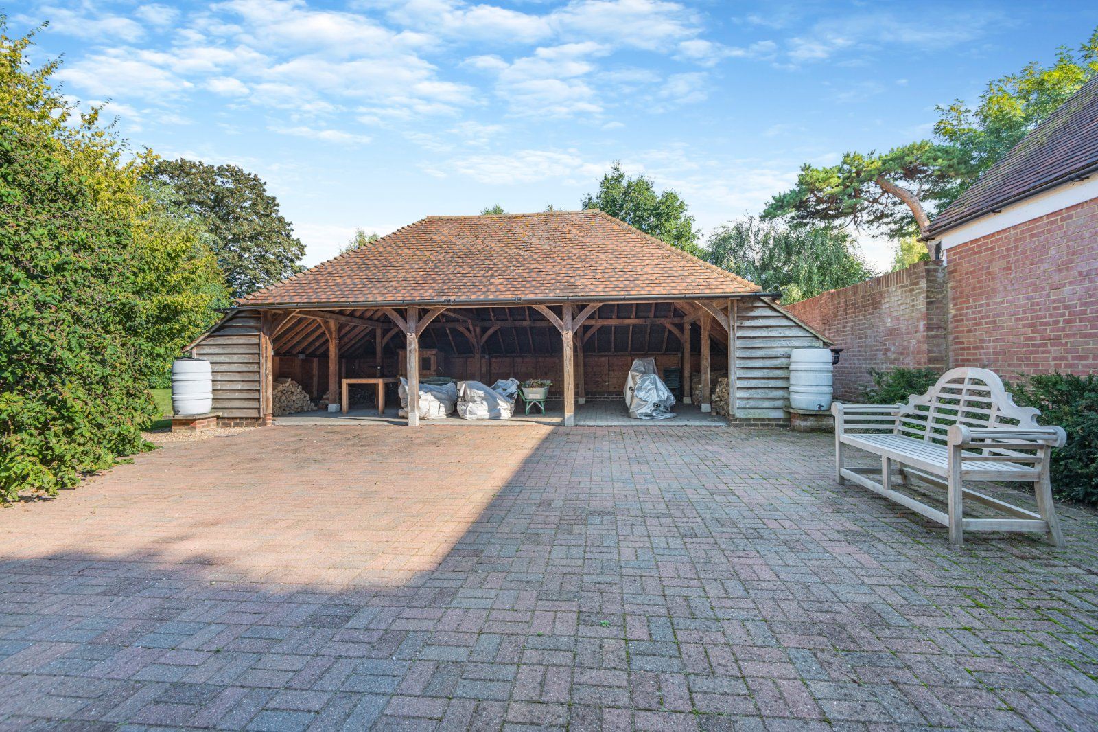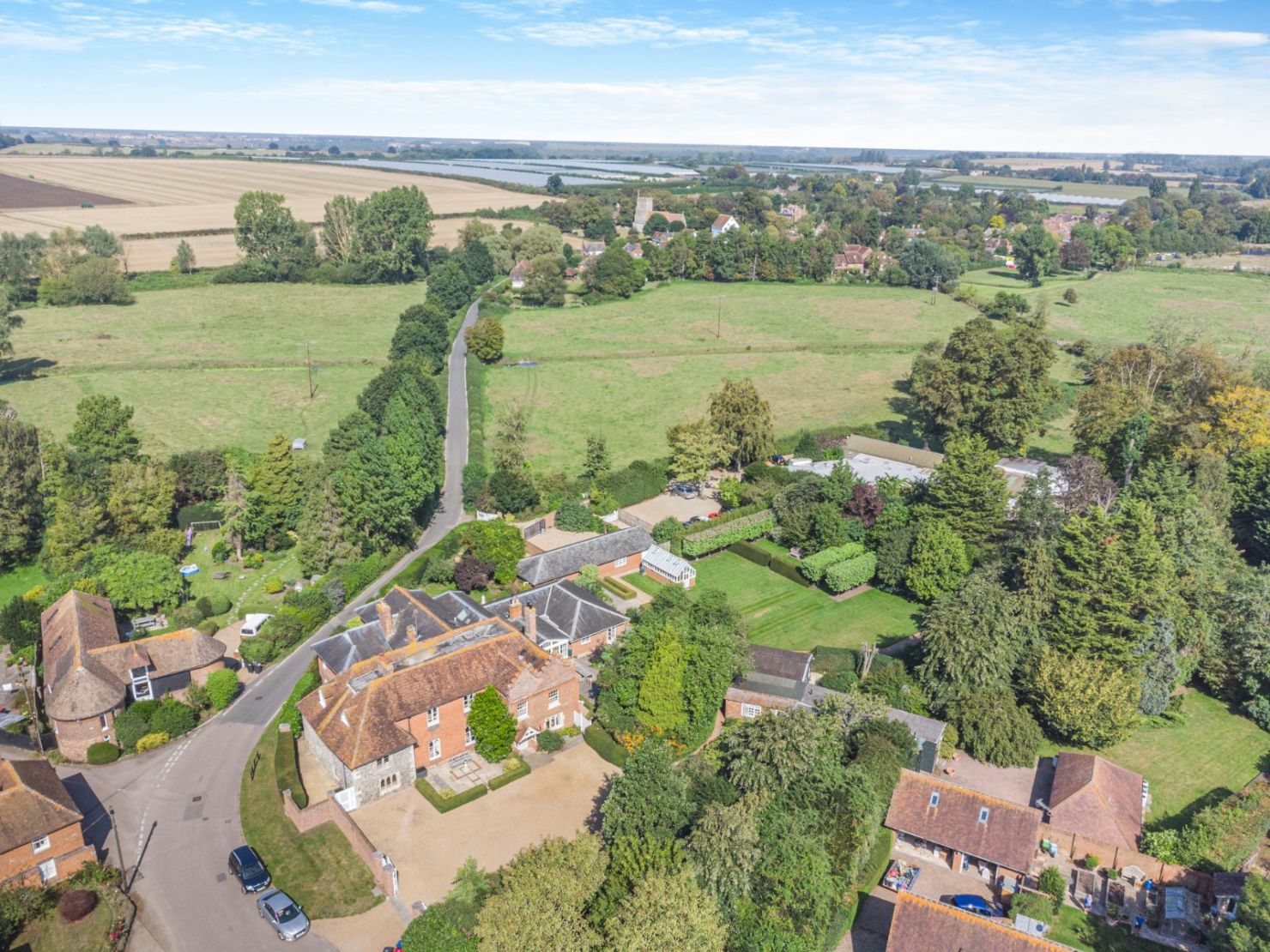 The property stands just off the village street within a peaceful and substantial private garden, A large gravelled forecourt provides ample parking and access to a triple oak-framed garage barn. A rear drive leads to a triple brick-built garage with attached shed and parking area. This is accessed by an electronic gate. Adjacent is a further parking area.