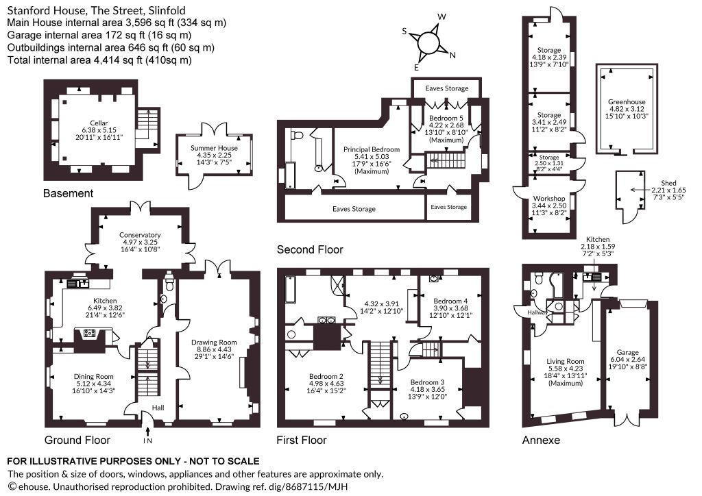 The ground floor comprises a series of elegant reception rooms, including a formal dining room with wooden flooring and a substantial triple-aspect drawing room with a fireplace and French doors opening onto the garden. The kitchen is fitted with contemporary cabinetry, and a double oven range-style cooker set within a mirrored splashback. It leads through to a light-filled conservatory providing an ideal space for everyday living and entertaining, with three sets of French doors opening onto a stone-paved patio. The spacious cellar is accessed via stairs from the kitchen. The upper floors accommodate five double bedrooms. The first floor provides three generous bedrooms served by a large family bathroom with a separate walk-in shower and twin basins. The second floor presents a principal suite, featuring extensive eaves storage and an en suite bathroom. A further bedroom on this floor benefits from built-in and eaves storage.