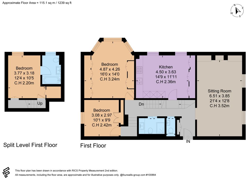 The principal bedroom suite is notably spacious, enhanced by a dramatic bay window, exceptional ceiling height and extensive bespoke wardrobes. Two further double bedrooms provide excellent versatility, with one benefitting from a stylish en-suite shower room, complemented by an additional well-appointed bathroom.
