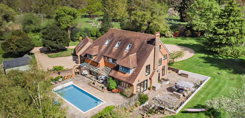 The welcoming reception hall is fitted with wooden flooring and a turned staircase rising to the galleried landing above. Doors lead to the main ground-floor reception rooms, which include the 25ft dual aspect drawing room with stylish wooden parquet flooring, open fireplace and south-facing bi-fold doors opening to the paved terrace and garden. Adjoining, in a semi open-plan layout, is the dining room, with the same wooden parquet flooring, and large picture window overlooking the pool and terrace, while the useful study to the front, has a door giving access to the terrace and garden beyond.